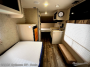 As you step into the toy hauler from the side man door, there is a removable table and rollover sofa immediately in front of you. A refrigerator, and wet bath with toilet run along the far side wall. At the front you will find a 28" top bunk with a 50" bunk below. As you continue around, there is a two burner range and single bowl kitchen sink. There is also a spot for an LCD TV mount on this wall. Overhead cabinets are featured above the sofa and in the kitchen area, and much more.
