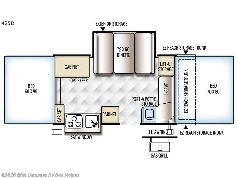Outside you will find an EZ Reach trunk storage, a 11' awning, and a gas grill, plus more!