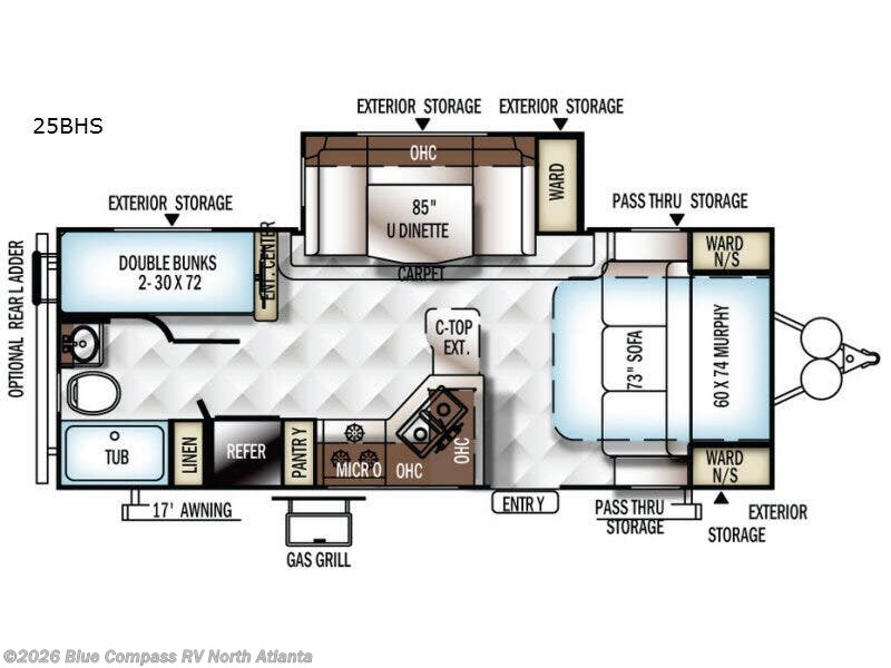 Outside you will find a 17' awning, a pass through storage area, plenty of exterior storage, a gas grill, and an optional rear ladder, plus so much more!