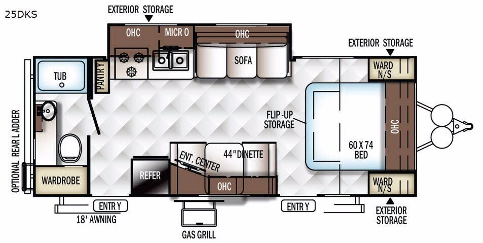 Outside you will enjoy grilling out with the gas grill. Storage shouldn't be a problem with the pass-through storage area, plus enjoy the shade of the 18' awning, and more!