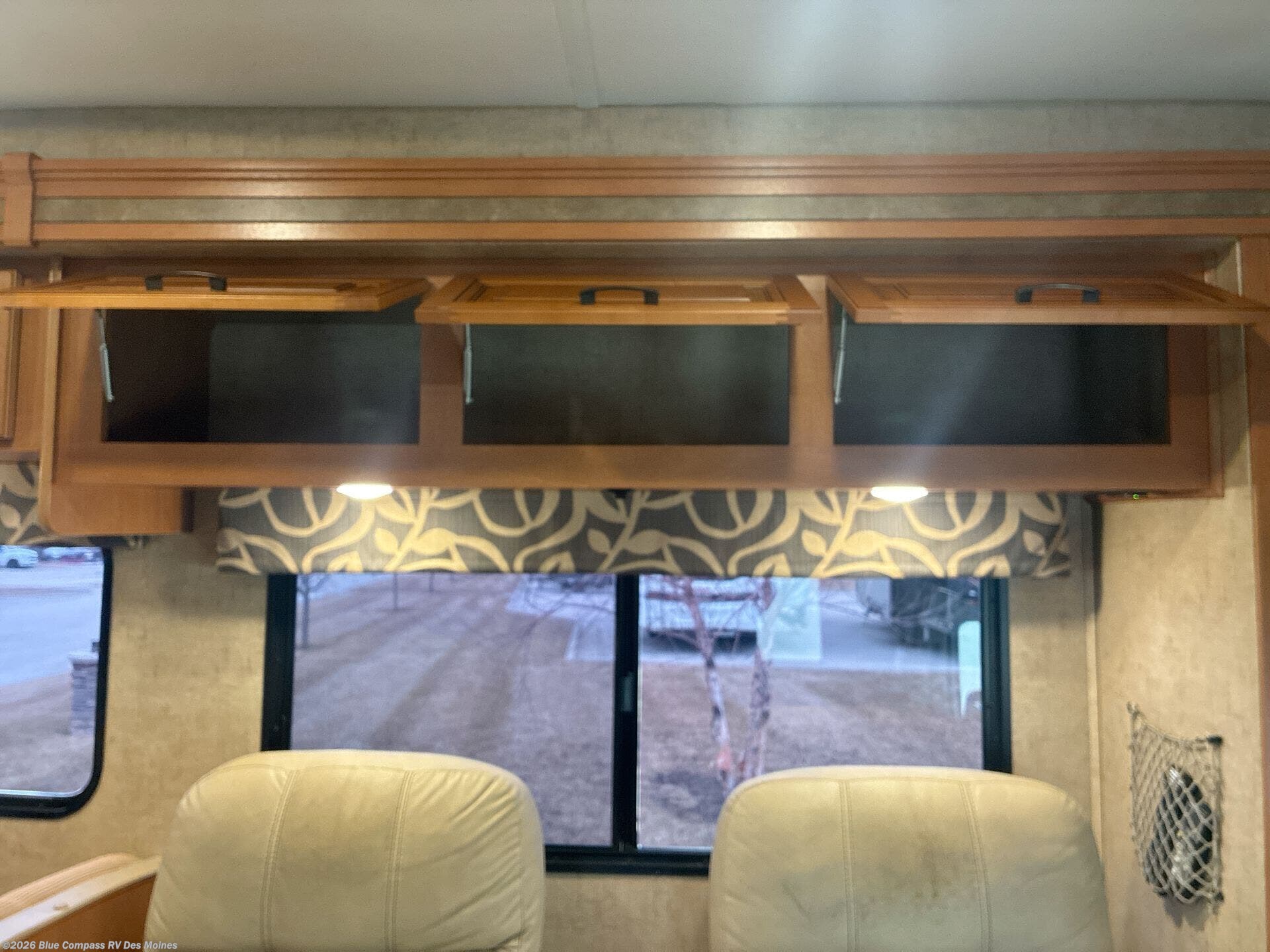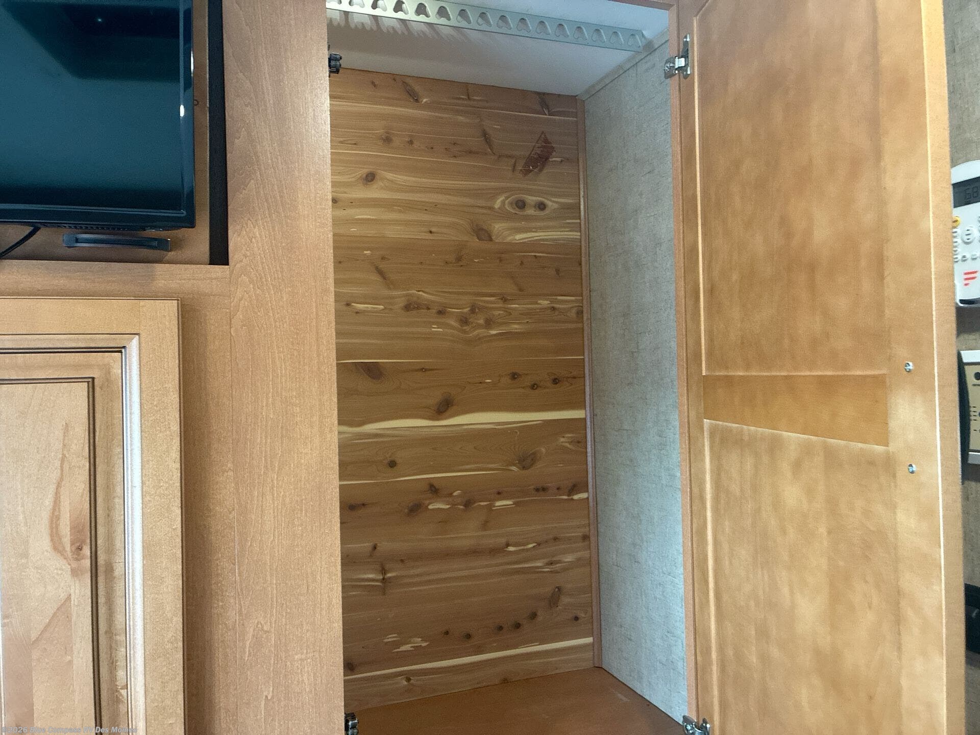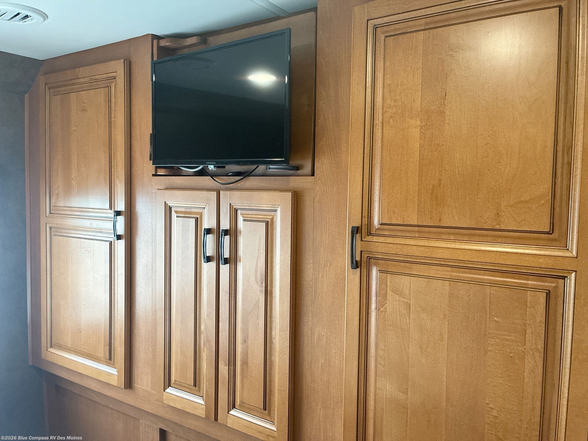 Back at the front, the area over the cab comes standard with storage and a 60" x 80" bunk, or a 42" TV with built in storage cabinets.