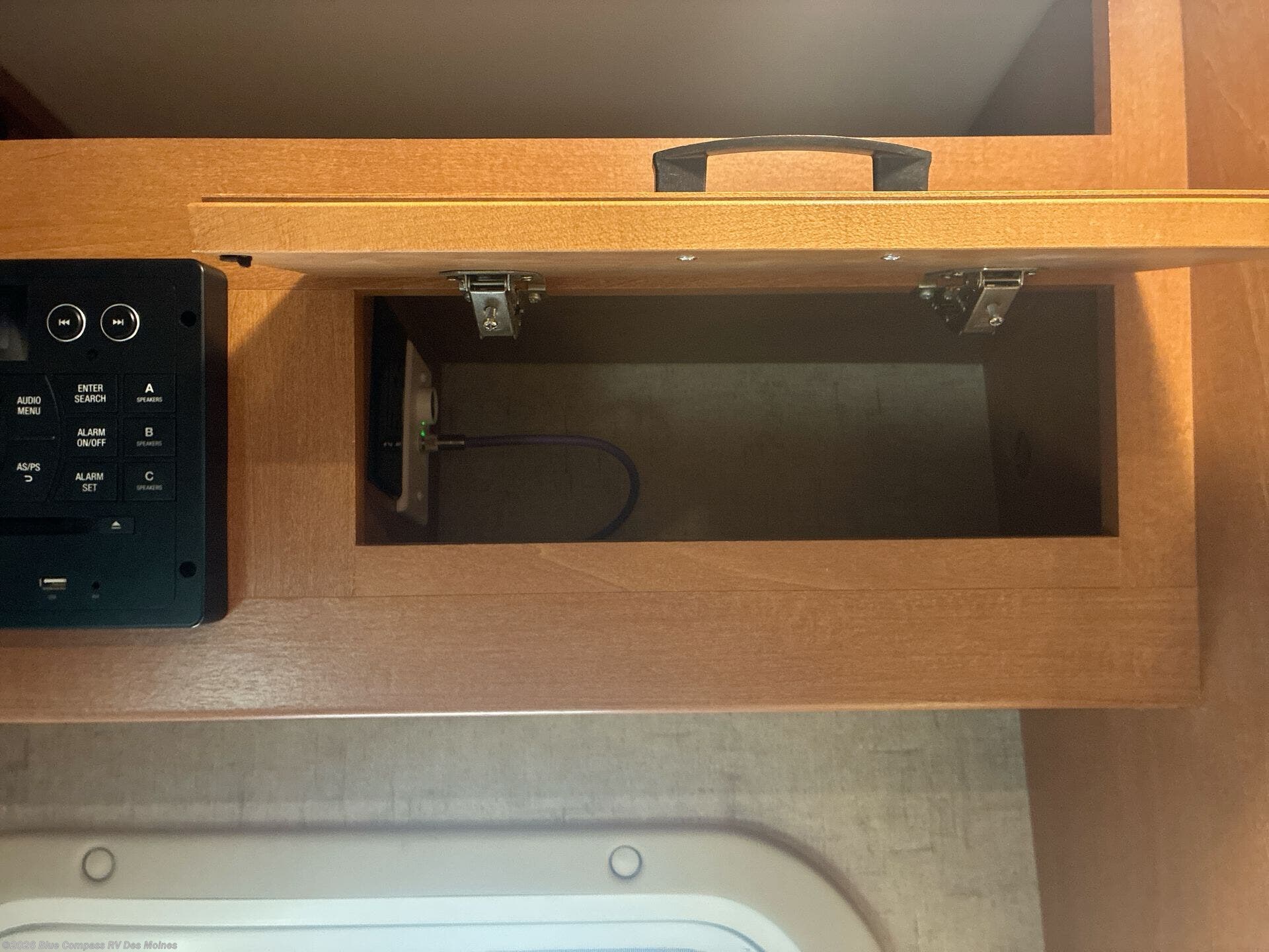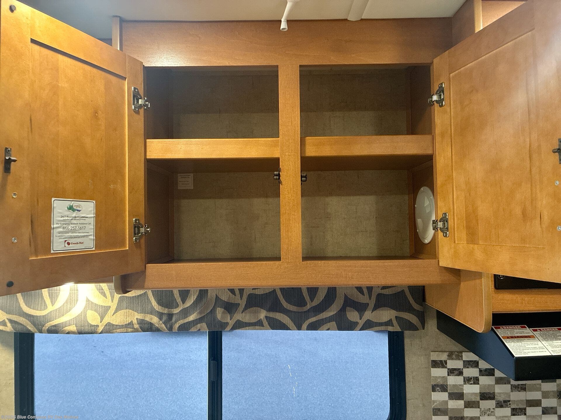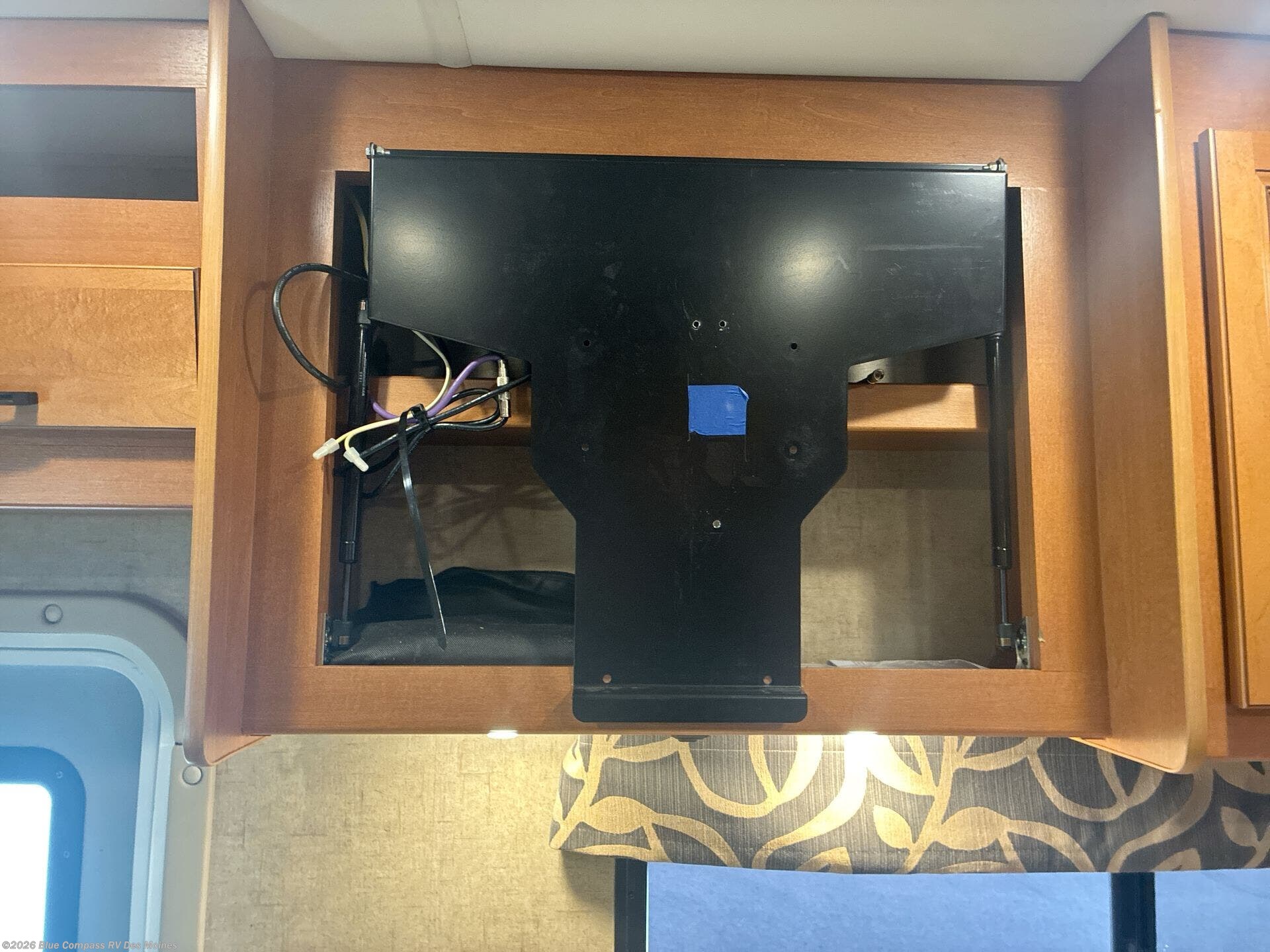 Back at the front, the area over the cab comes standard with storage and a 60" x 80" bunk, or a 42" TV with built in storage cabinets.