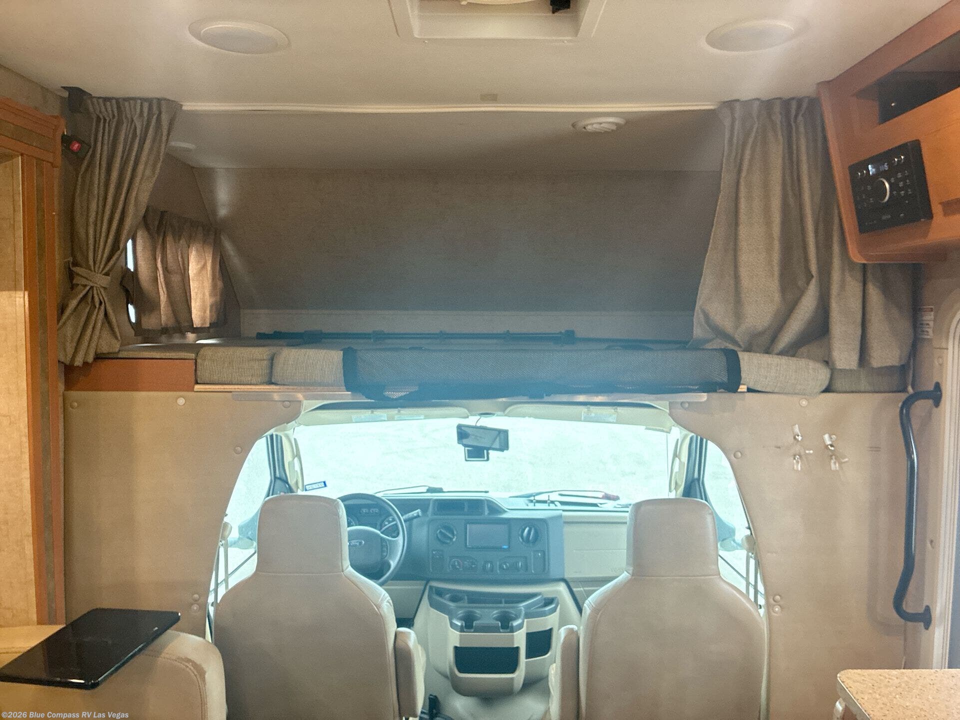 Back at the front, the area over the cab comes standard with storage and a 60" x 80" bunk, or a 42" TV with built in storage cabinets.
