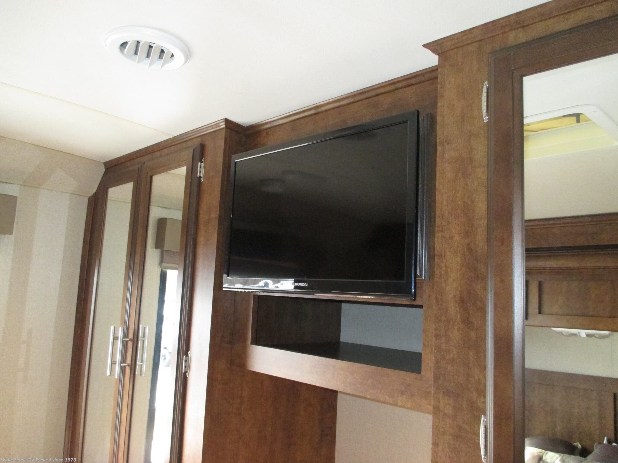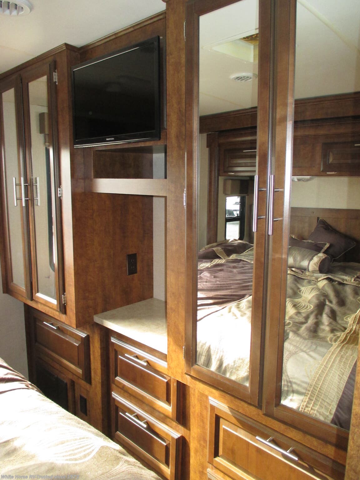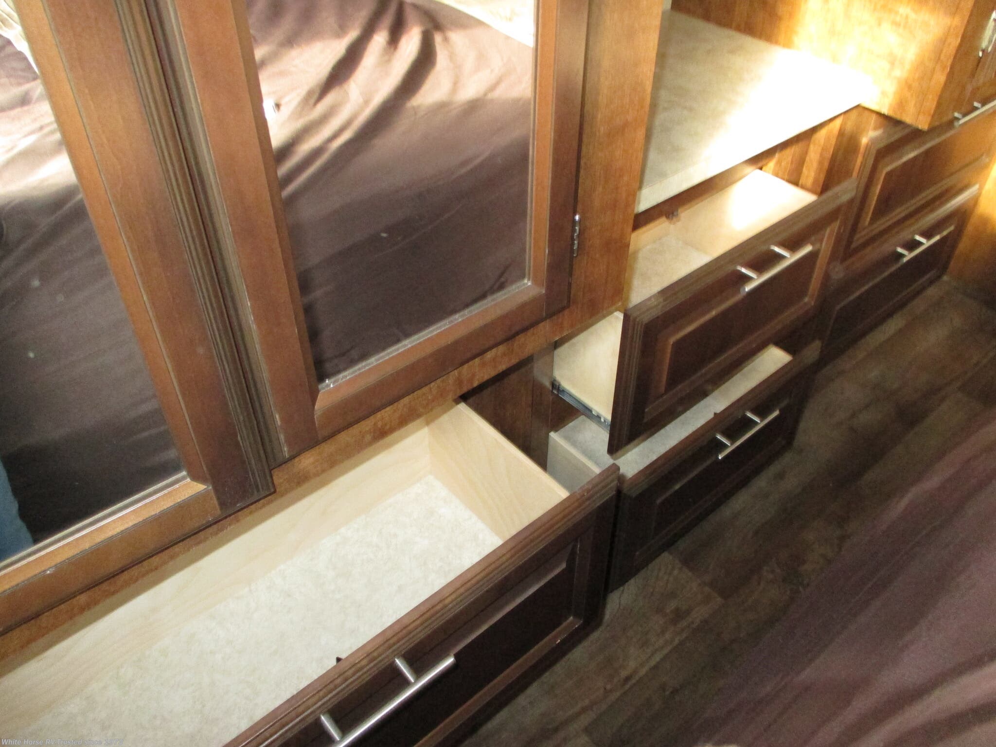 - Rear Bedroom Suite with Walk-Around East-West 70 x 80" King Bed Slide, Overhead Storage Cabinets, Vanity, Chest of Drawers, Mirror Wardrobes, and Bedroom TV!