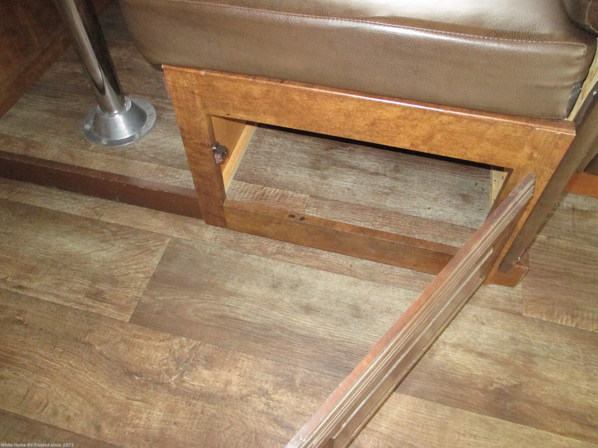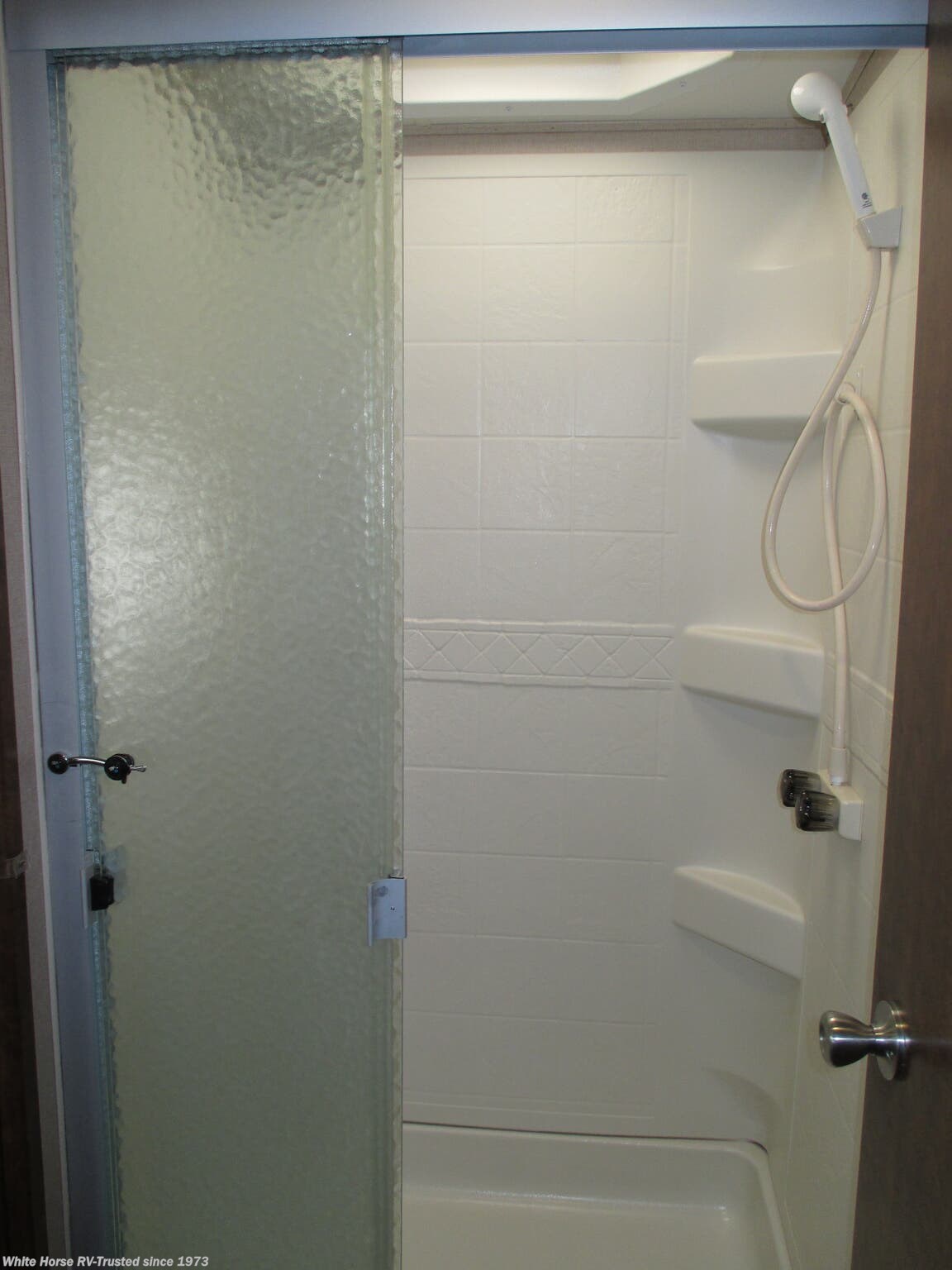 Booth Dinette, Dinette Bed, Glass Shower Door, Hide-A-Bed, King Size Bed, Overhead Cabinetry, Self Contained, Vanity, Wardrobe(s)