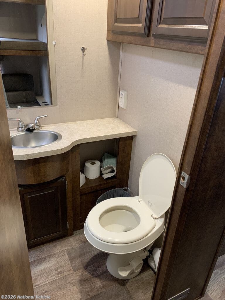 The centrally located full bathroom includes a shower, vanity, and linen storage, offering everyday convenience on the road. Outside, enjoy features like a power patio awning for shaded outdoor living, ample exterior storage, and easy-to-use hookups that simplify campground setup.