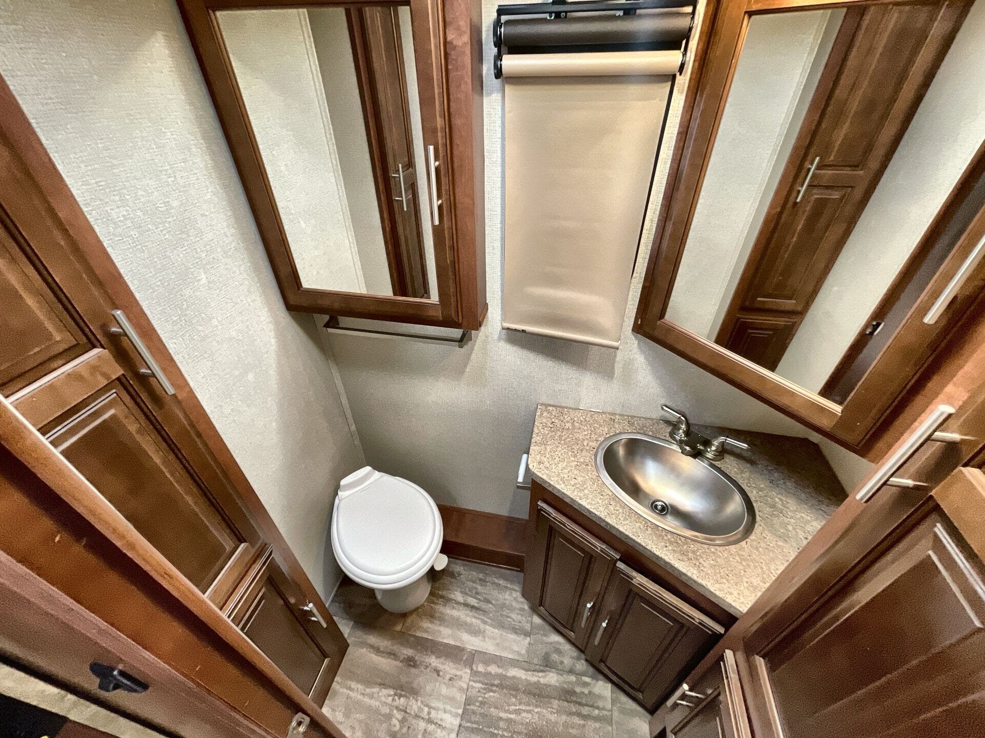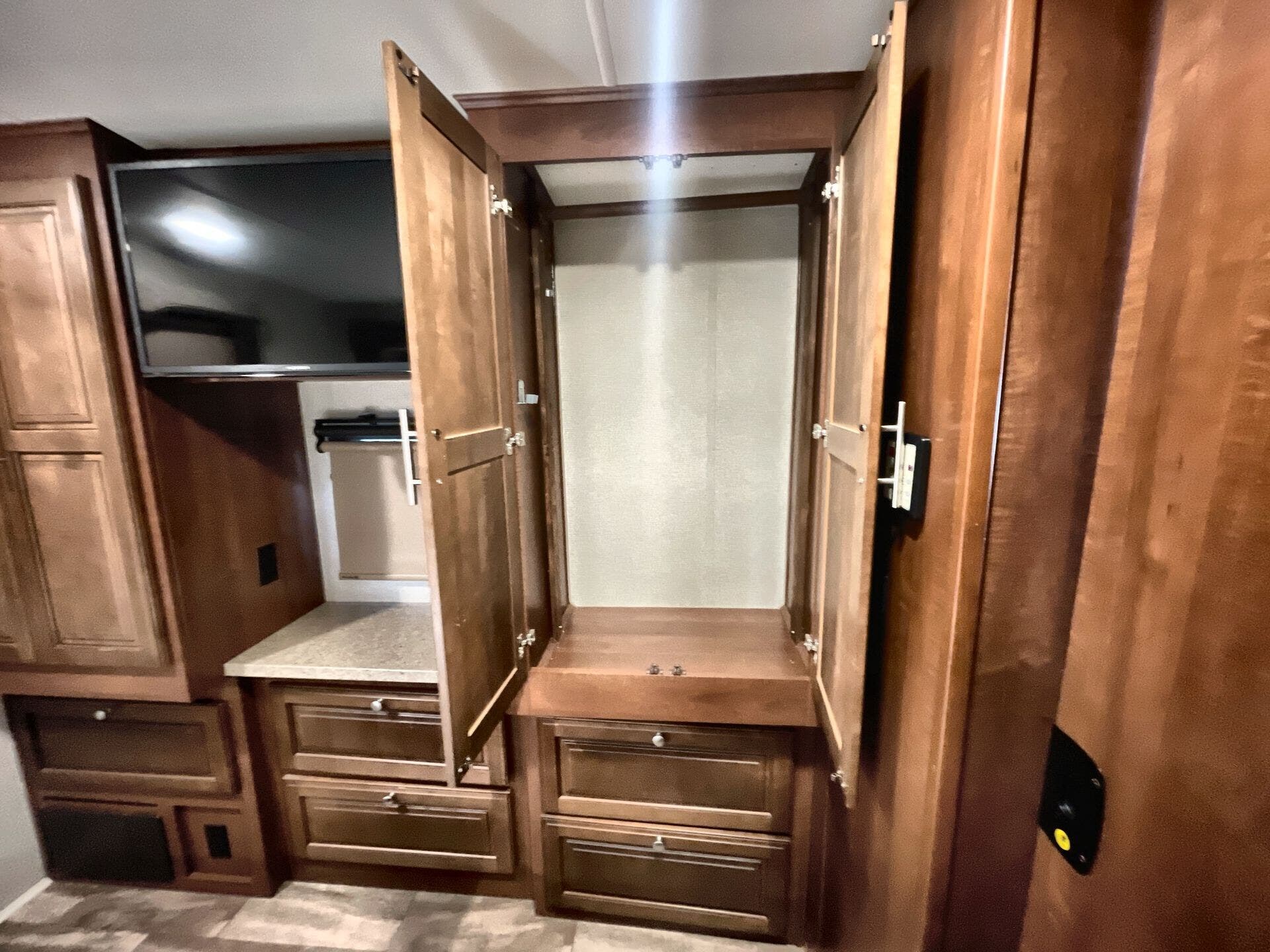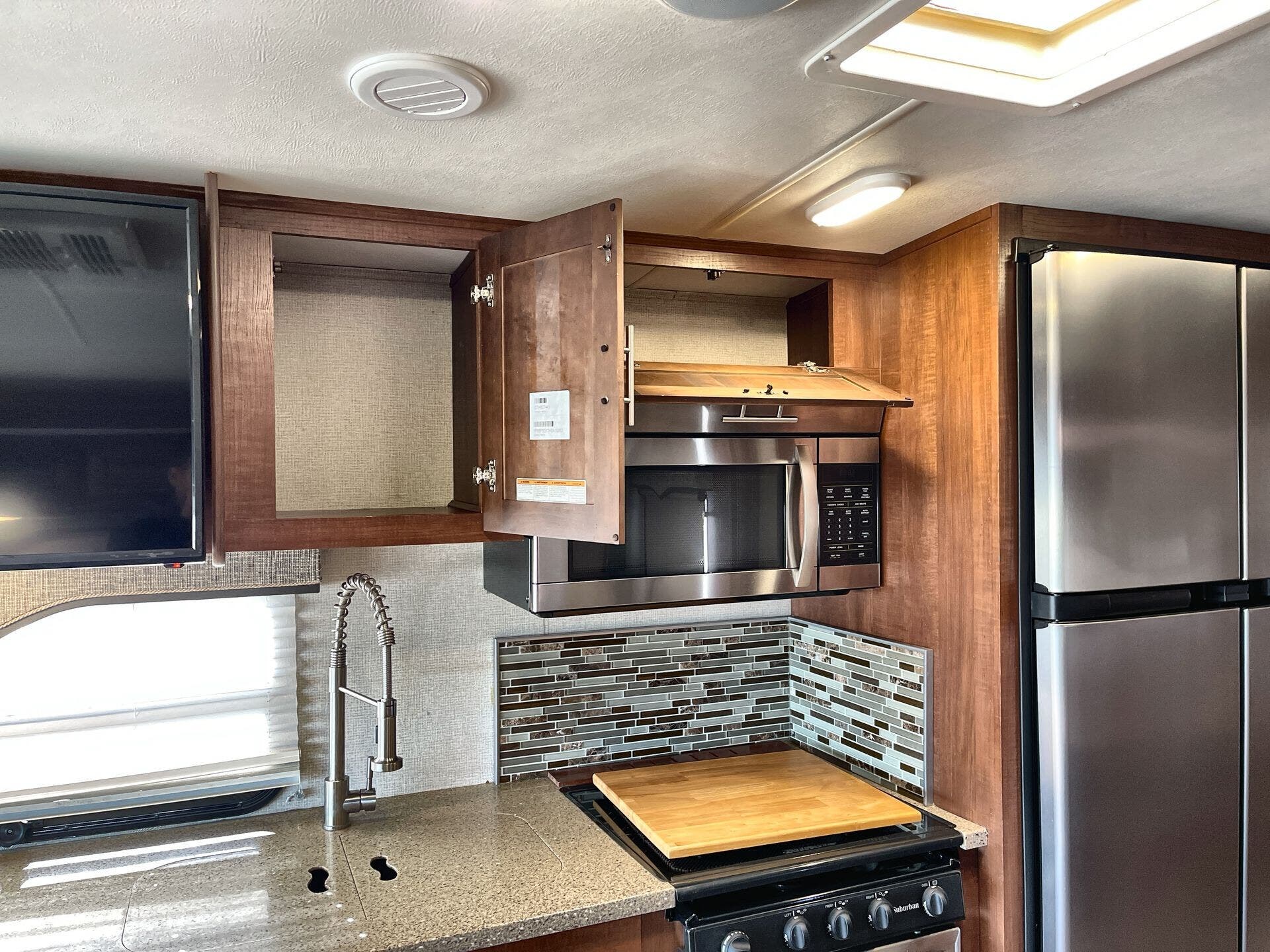 The 31R floorplan centers on a welcoming Front Kitchen and Front Living Area, designed for socializing and cooking on the go. A Mid Bath separates the living zones from the Rear Bedroom, offering privacy after a day of travel. Ample storage, including a pantry and medicine cabinet, helps keep essentials organized, while the dinette provides a convenient dining nook. With a well-lit interior and functional galley, this layout delivers both comfort and practicality for seasonal adventures or weekend escapes.