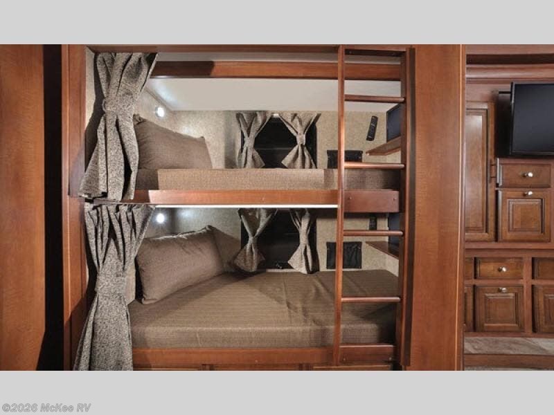Across from the bathroom and leading into the bedroom there is a slide with a set of bunk beds, plus a large wardrobe and TV inside the bedroom. Across from the wardrobe you will find a slide out king bed with nightstands and overhead storage.