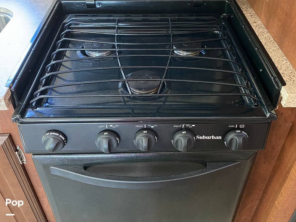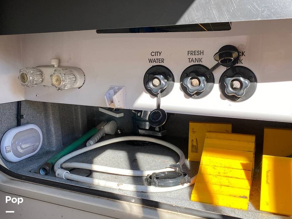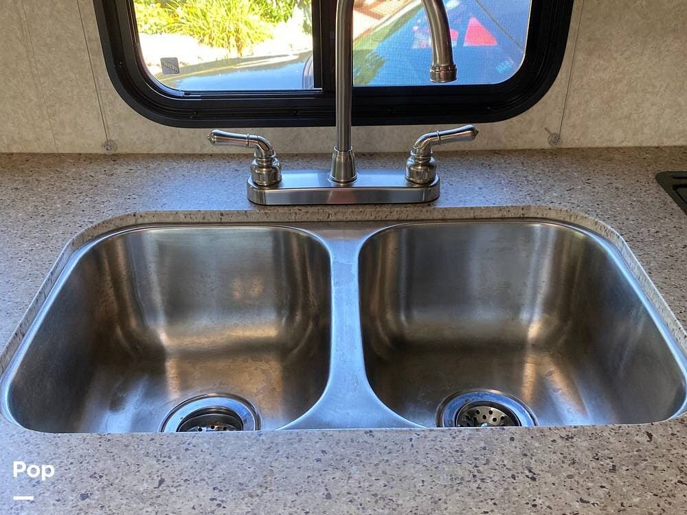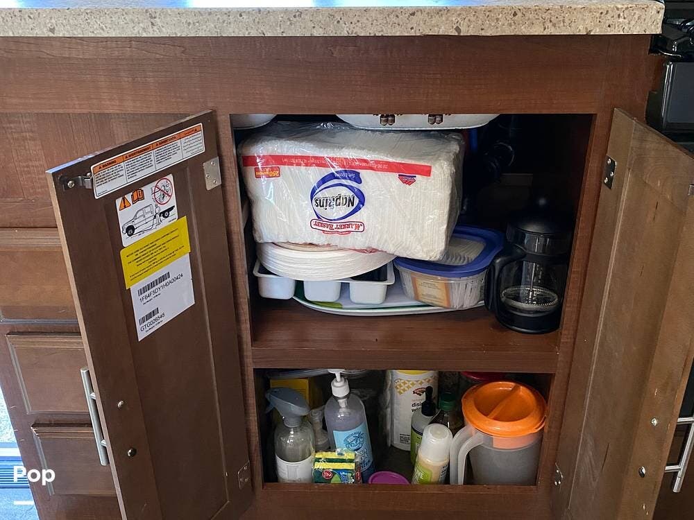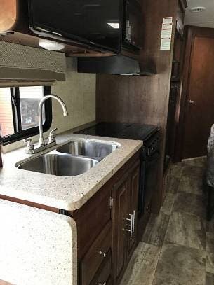 Opposite that is the kitchen, which is thoughtfully laid out with a double kitchen sink, stove, and microwave. To keep things chill on board, you end the kitchen area with a nice-sized refrigerator with a freezer.