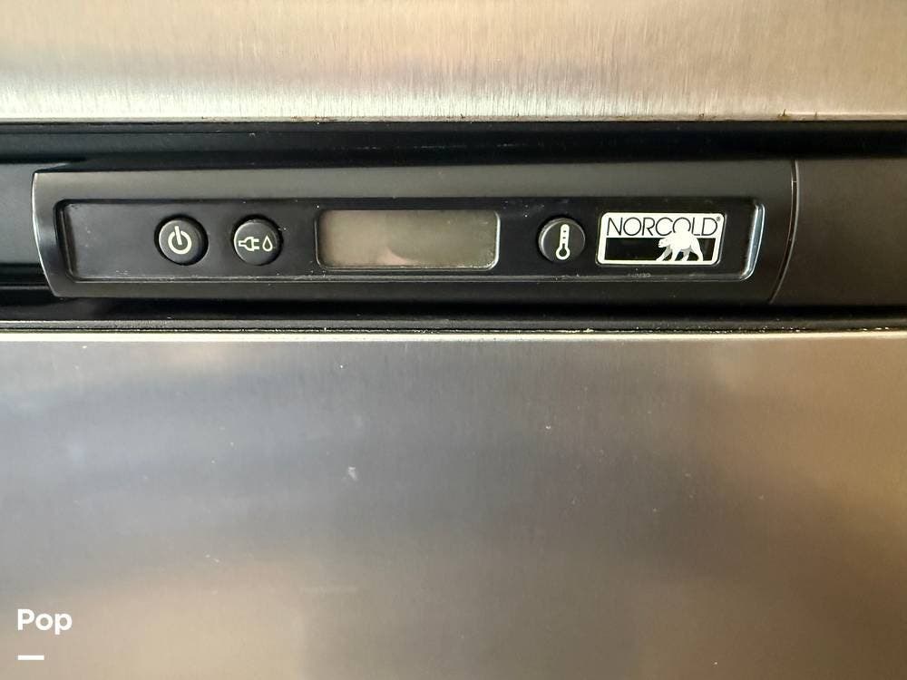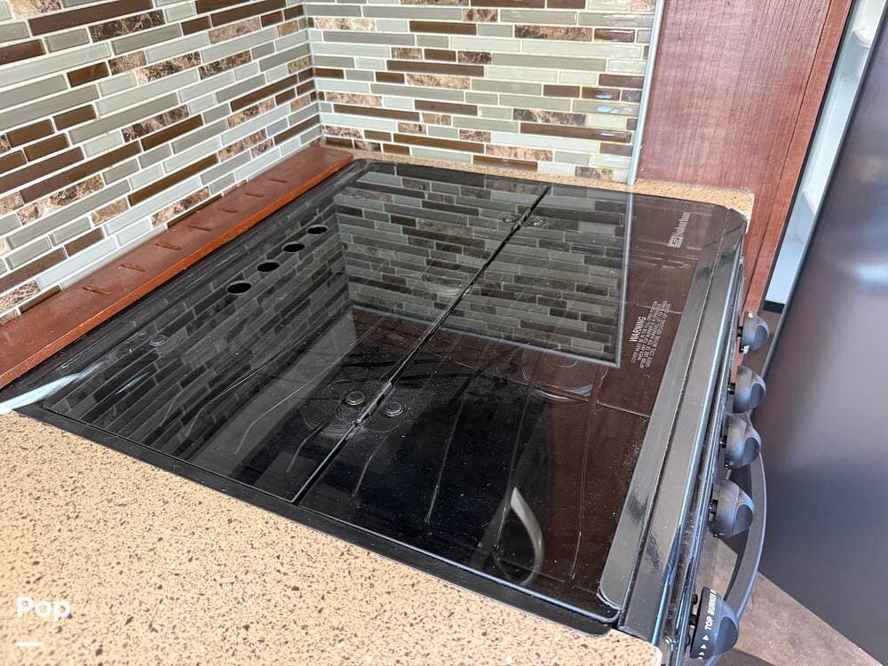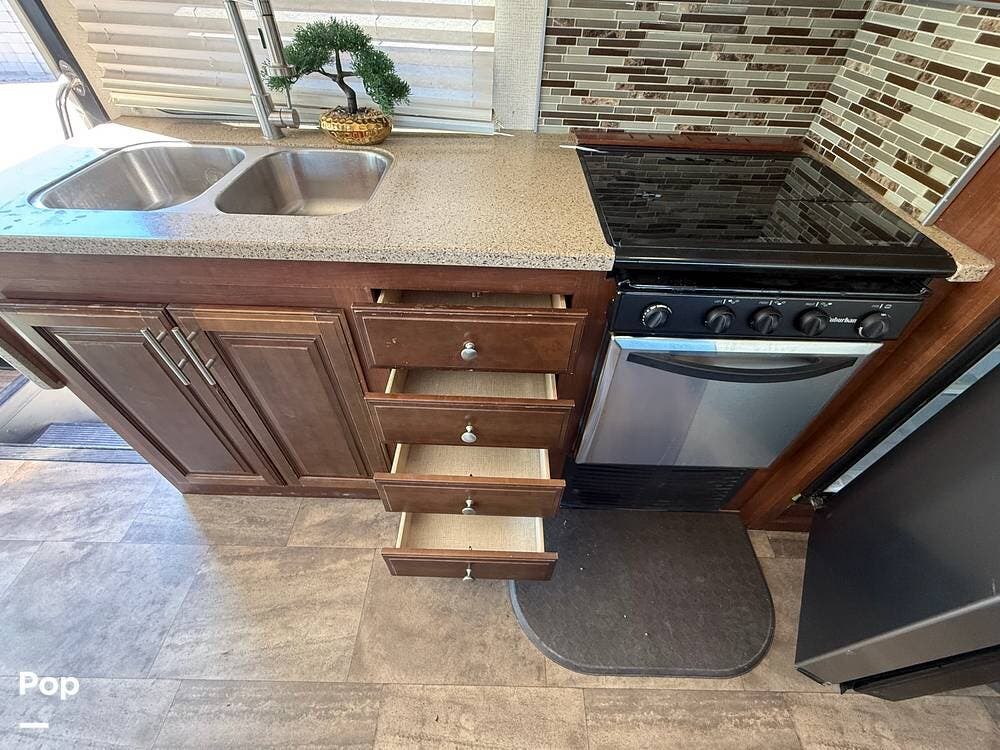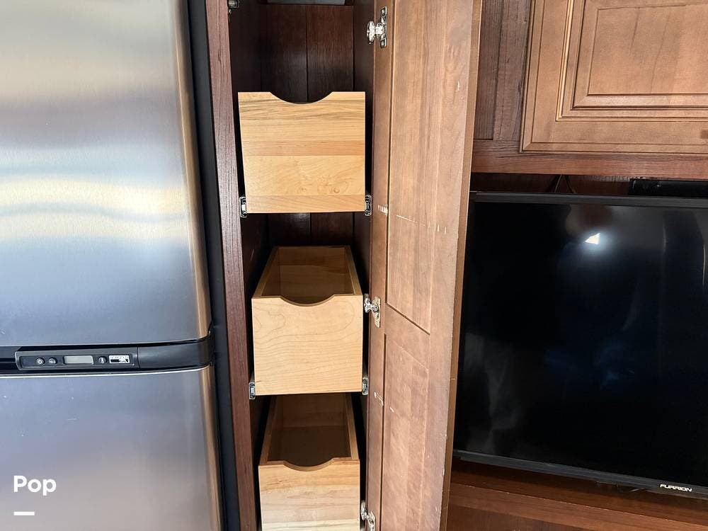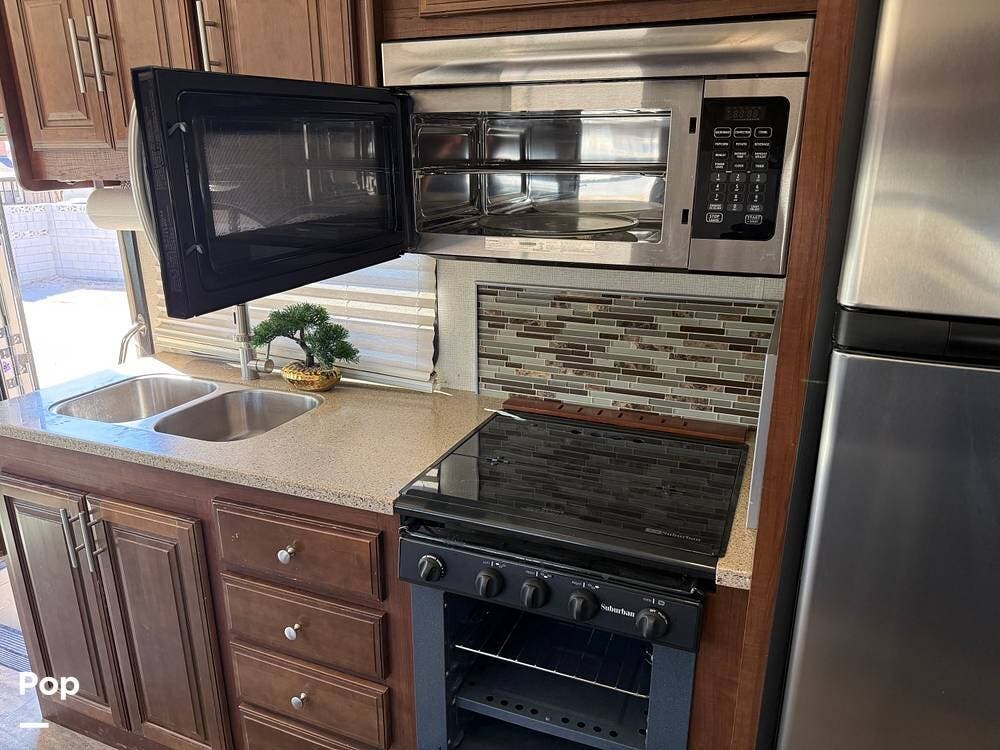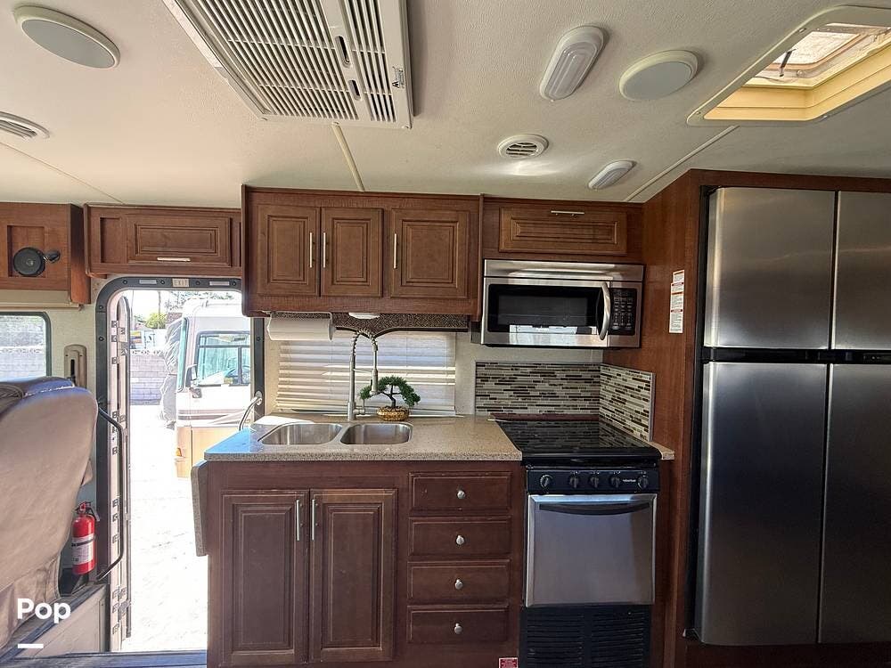 18 cf Norcold refrigerator/freezer, microwave, 3-burner stove with oven, ventilation fan, dual sink with solid-surface countertops, pantry, and abundant cabinet storage.