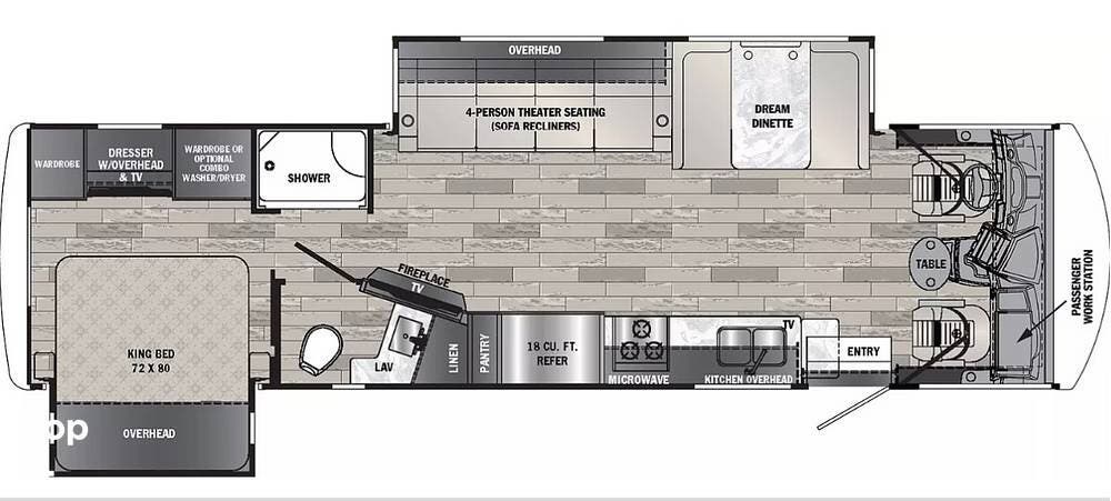The Georgetown's open and comfortable interior includes 82" ceiling height, full roadside slide with L-shaped sofa, dinette with pull-out bed, fireplace, LED lighting throughout, three TVs (located in bedroom, mid-cabin and outside) -- perfect for relaxing, entertaining, or extended travel.