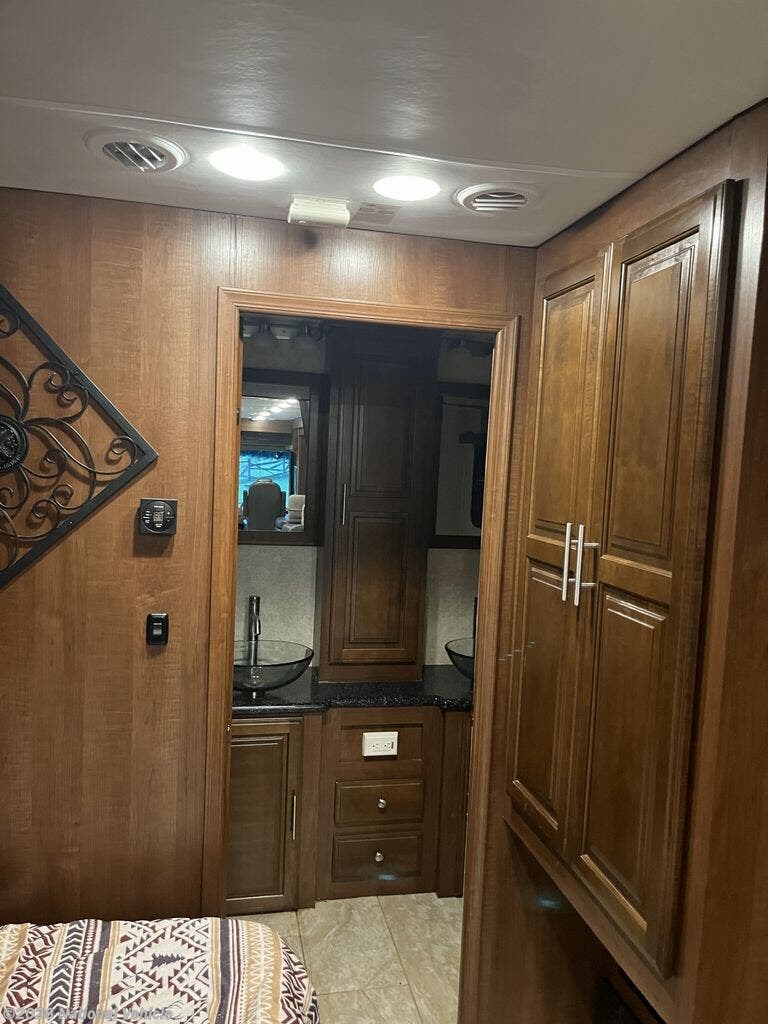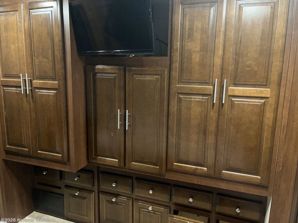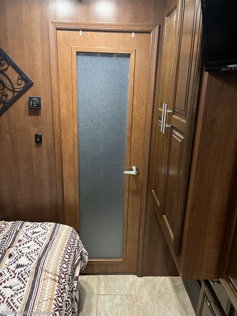 The walk-through bedroom features a king bed slide with overhead cabinets. There is also a wardrobe and TV.
