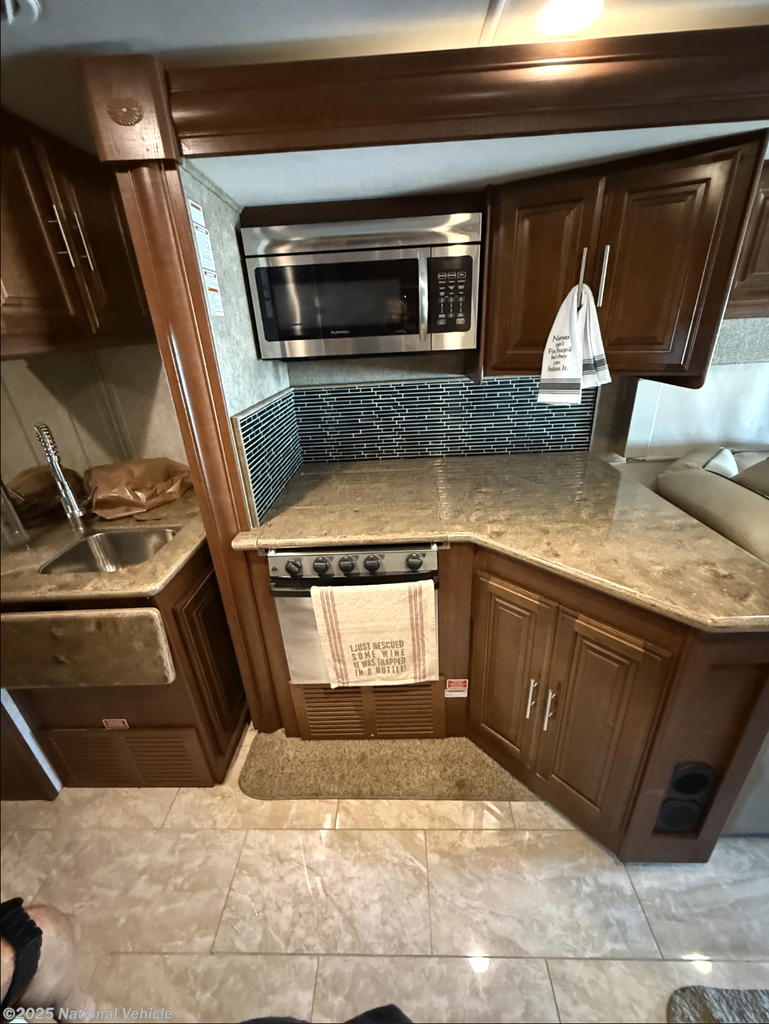 Inside, the 378TS features a rear living floorplan with dual slide-outs, creating an open and inviting space. The living area includes a sofa, theater seating, and a large entertainment center, perfect for relaxing or entertaining guests. The fully equipped kitchen boasts solid-surface countertops, a residential refrigerator, stovetop, oven, microwave, and abundant cabinetry, making meal preparation convenient and enjoyable.