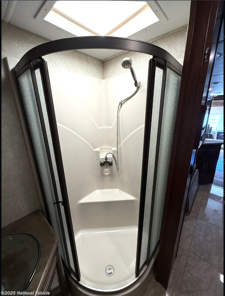 The private master suite features a walk-around queen bed, wardrobe storage, and additional storage options throughout the coach. A full bathroom with shower and vanity adds convenience for extended trips. Additional highlights include climate control, power awnings, exterior storage, and a reliable chassis that ensures confidence on long journeys.