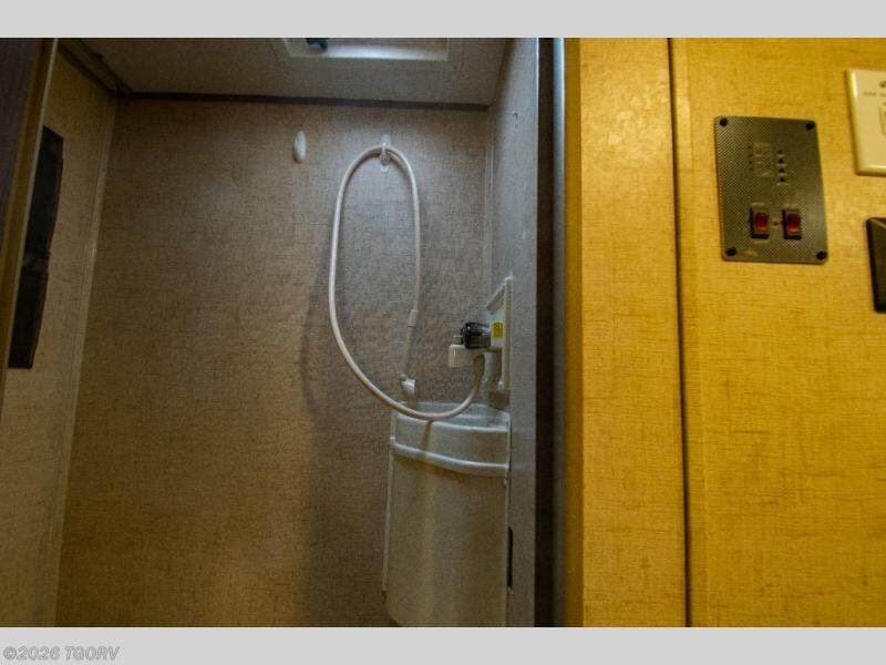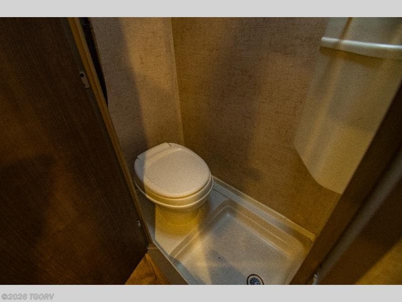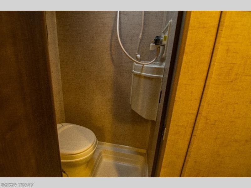 Along the curb side you will find a convenient wet bath featuring a toilet, shower, and corner sink. There is a wardrobe for clothing storage just outside the bathroom along the curb side between the bath and the front queen size bed.