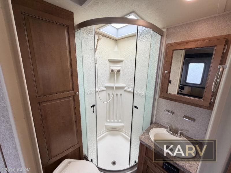 The rear corner bathroom has a toilet, linen storage, radius shower, and a sink with overhead medicine cabinet.