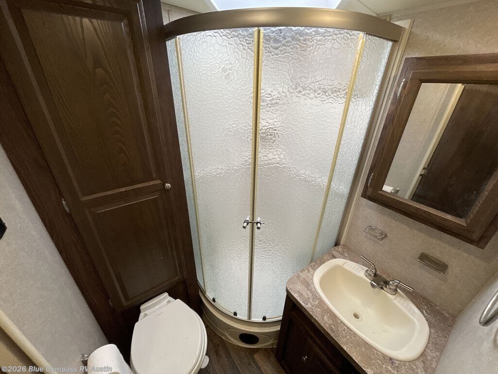 Directly across from the entry there is a rear corner bathroom with a toilet, radius shower, linen storage, sink and medicine cabinet. Continuing around, there is a wardrobe, refrigerator, entertainment center, and 44" booth dinette with overhead cabinets.
