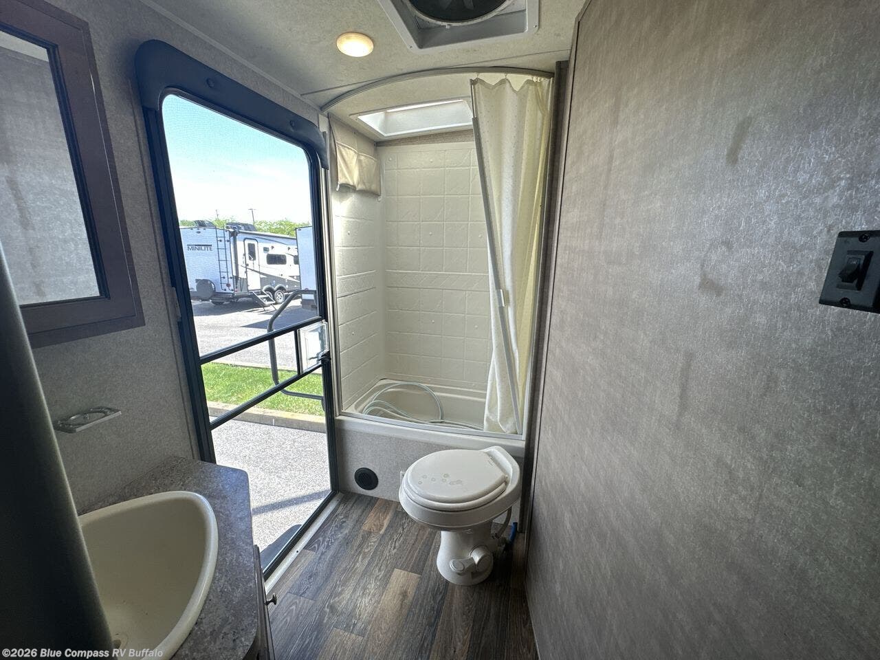 In the rear bathroom you will find an angled sink, medicine cabinet, toilet, and a shower/tub. The second entry/exit door to the trailer allows you access to the outside from the bath.