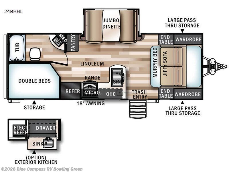 The large front pass through storage compartment is perfect for all of your outer camping gear, and you will find more storage beneath the double bed bunks. You can even choose to add the optional exterior kitchen with a refrigerator, sink, drawer, and much more!