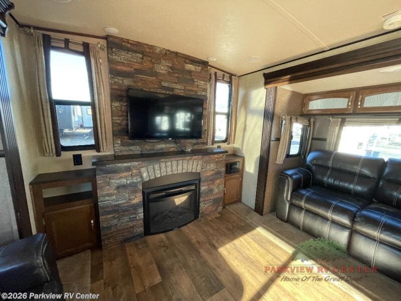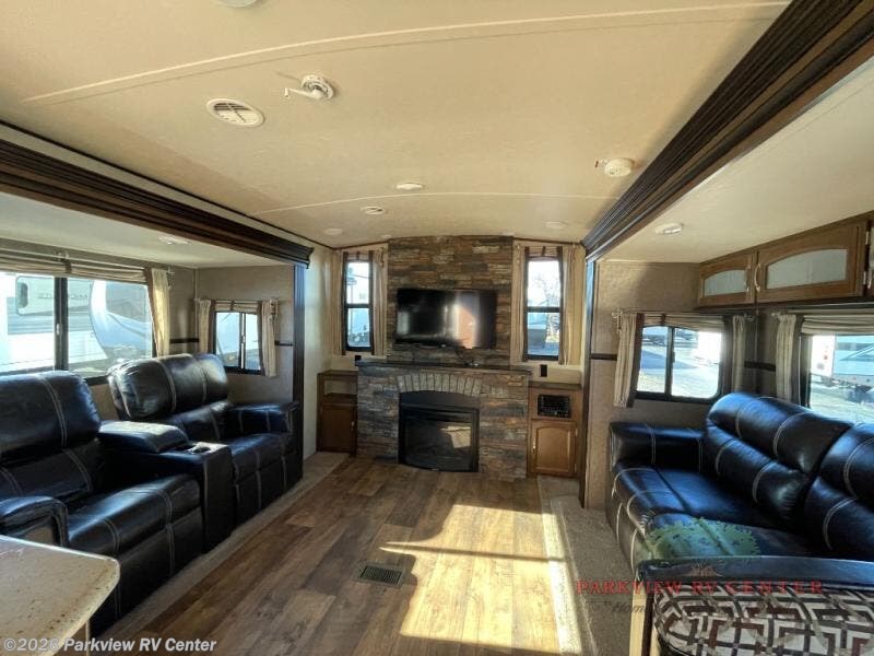 The main living area offers dual opposing slides. One slide has theater seating for two. The second slide has a tri-fold sofa and jumbo dinette. Along the rear wall you will find a large entertainment center with a fireplace below and extra storage.