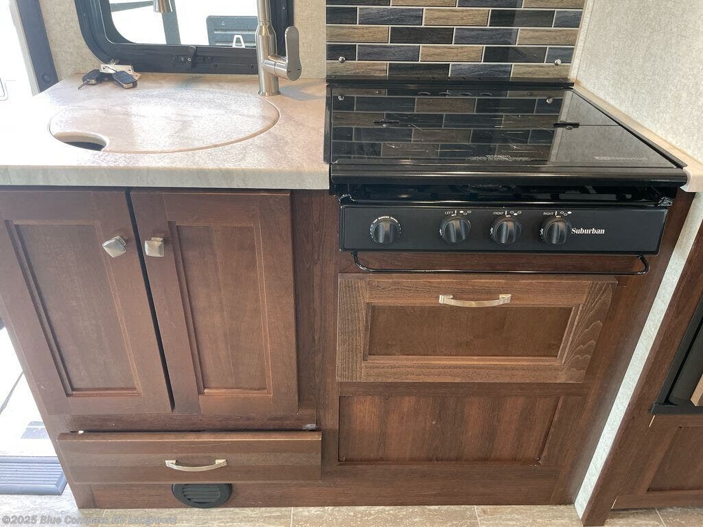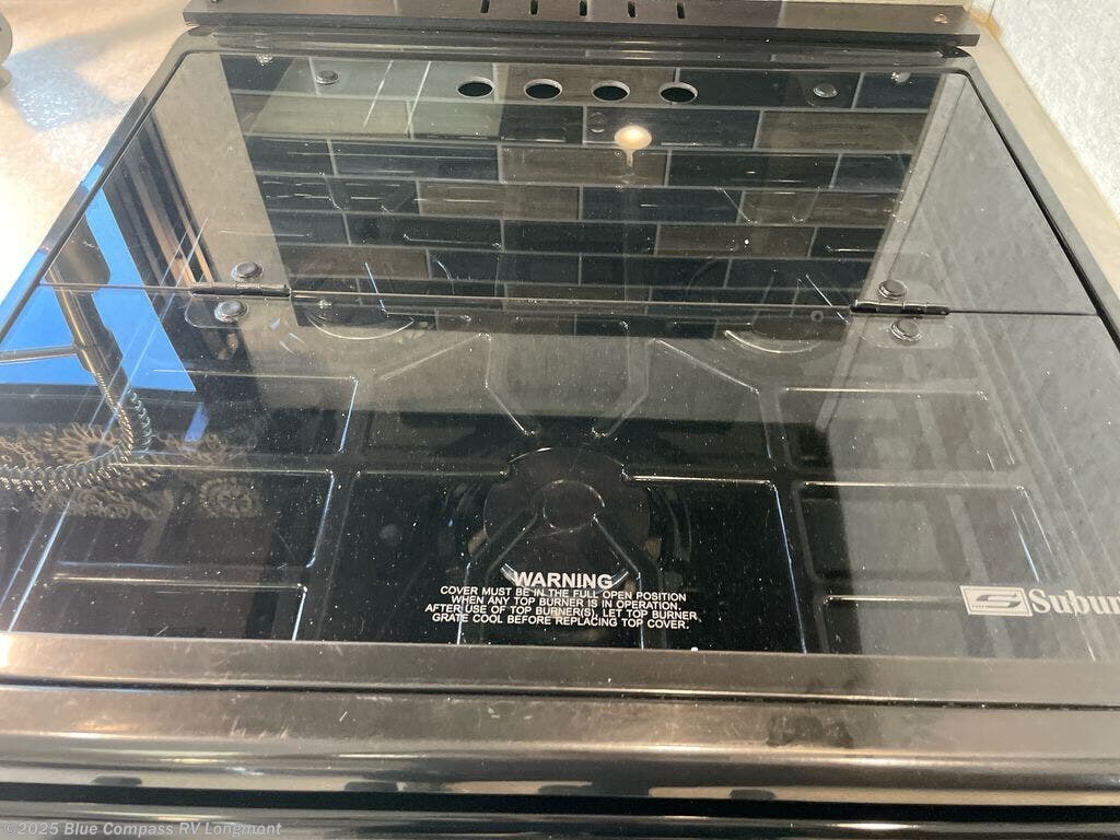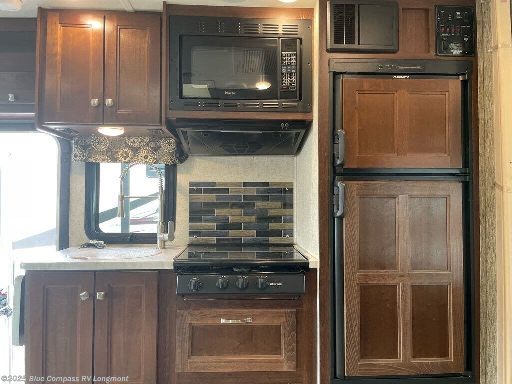 The kitchen area features a large refrigerator, three burner range, overhead microwave and cabinets, angled double kitchen sink, and a flip counter top, plus more!