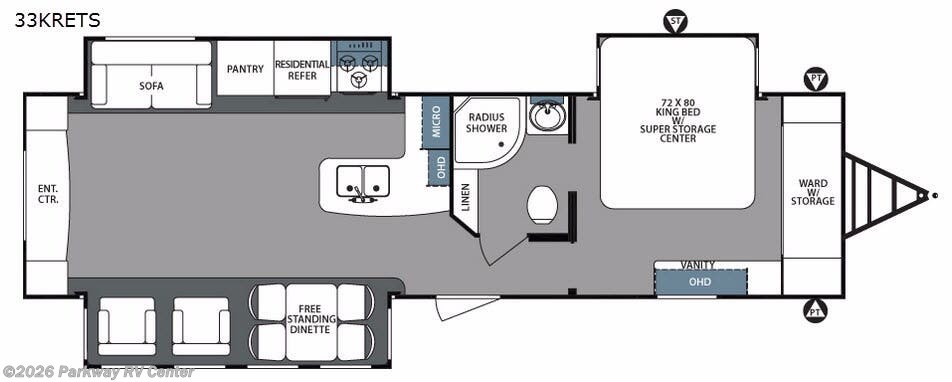 The triple slide Surveyor 33KRETS by Forest River features a rear entertainment center. You will love all of the space in the rear of this model!