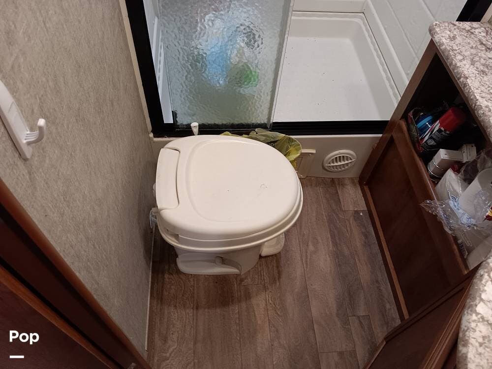 The bathroom has a porcelain toilet, a spacious shower, and a vanity with a sink. With its modern fixtures and ample space, the bathroom provides a comfortable and convenient place to freshen up after a long day of outdoor activities.