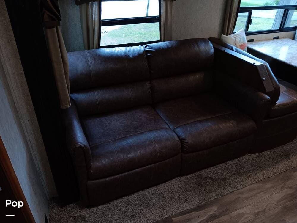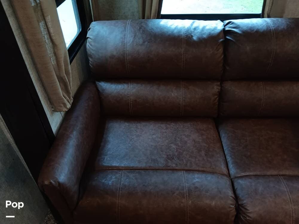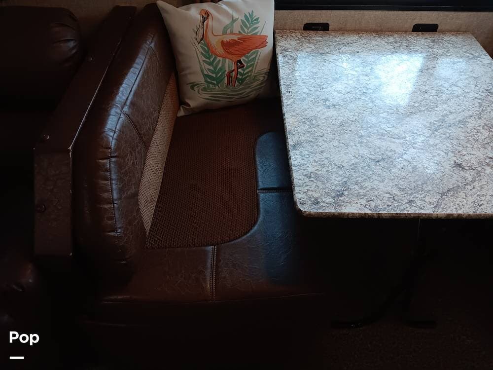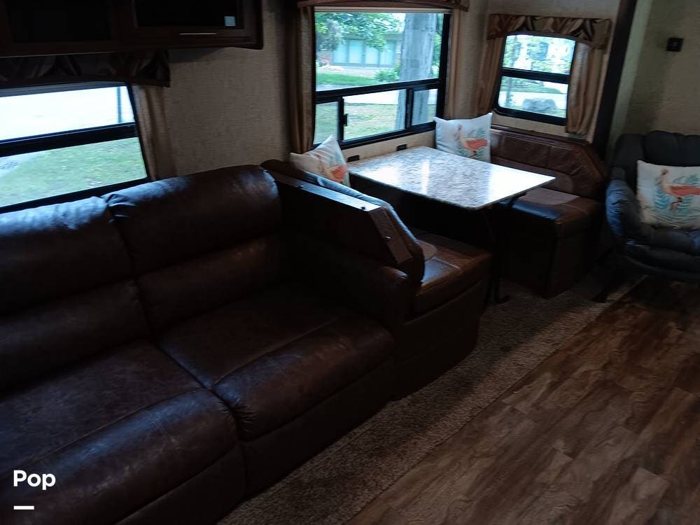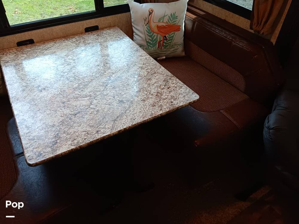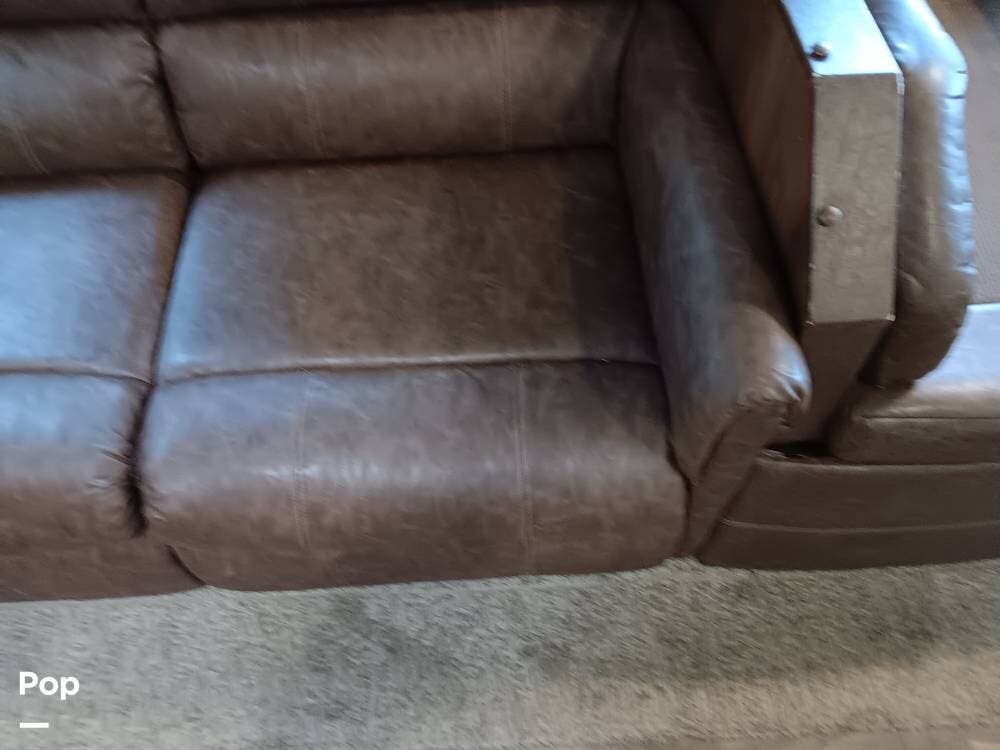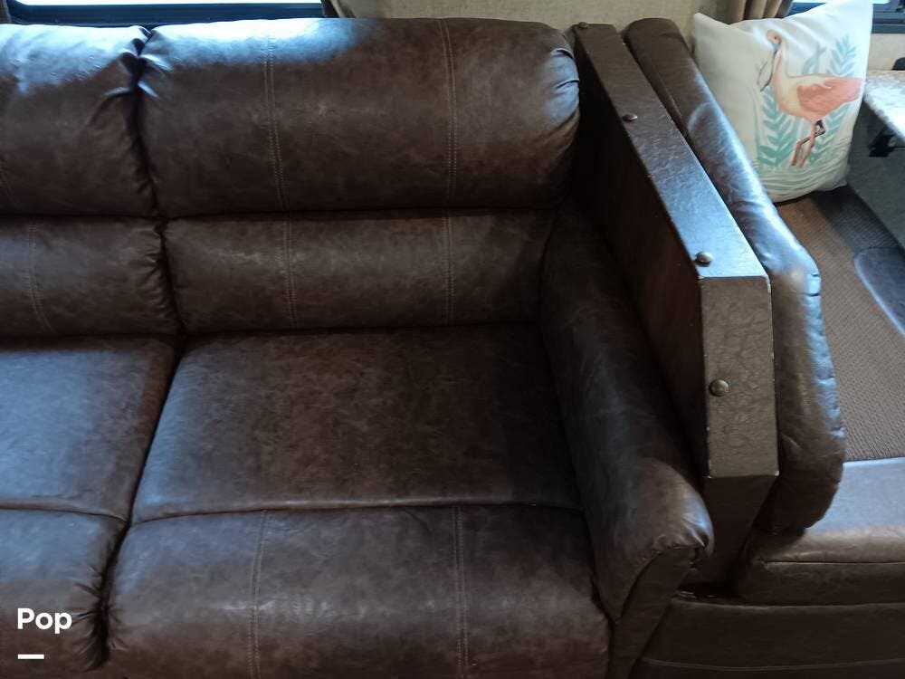 The living area has a cozy sofa and a booth dinette, providing ample seating for family and friends. Whether enjoying a meal, playing board games, or relaxing, this versatile space offers comfort and convenience. The large panoramic windows allow natural light to flood the interior, creating a bright and airy atmosphere.