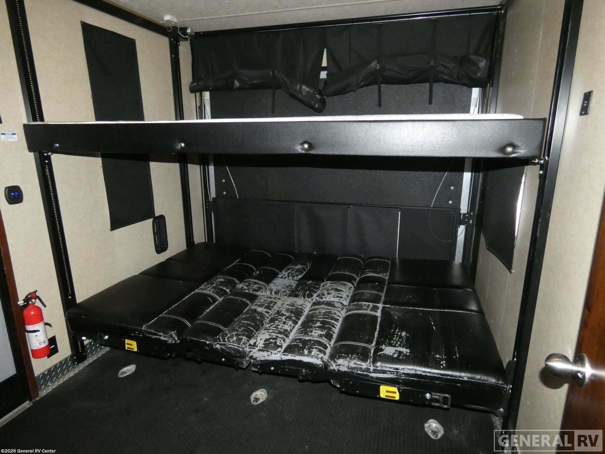 As you enter the cargo area of this Vengeance 31V Super Sport toy hauler travel trailer by Forest River you will find a large rear ramp door with lots of cargo space for your toys, a side man door, plus a TV mount. The main living area includes a slide out sofa with recliners. The TV is above the refrigerator for your enjoyment. On the opposite side of the trailer you can make your meals at the three burner range, warm up your food in the microwave, clean up your dishes in the double kitchen sink on the L-shaped countertop, and store food in the refrigerator. The main entry door is next to the kitchen amenities. In the side aisle bath you will find a sink, medicine cabinet, neo-angle shower, and a toilet. The front bedroom features a king bed, two wardrobes, and an overhead cabinet for your personal belongings. You may choose to add two rollover sofas plus a free standing table in the cargo area. There are overhead cabinets throughout the trailer for your dishes and things, and you are sure to enjoy the exterior pass through storage for your outdoor gear, plus so much more!