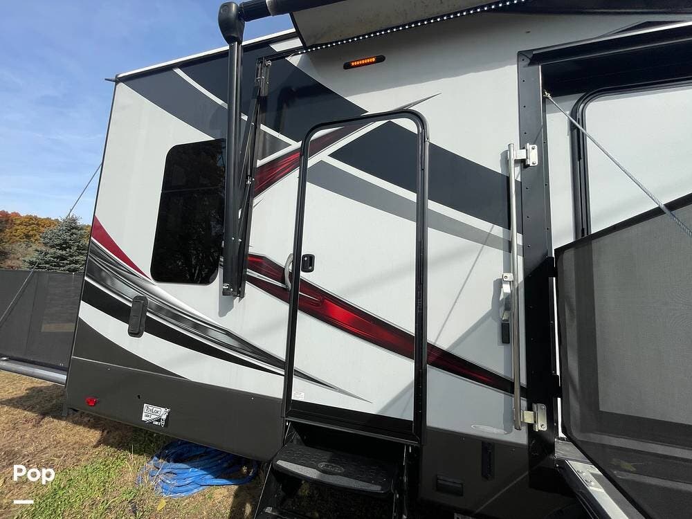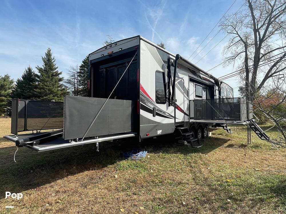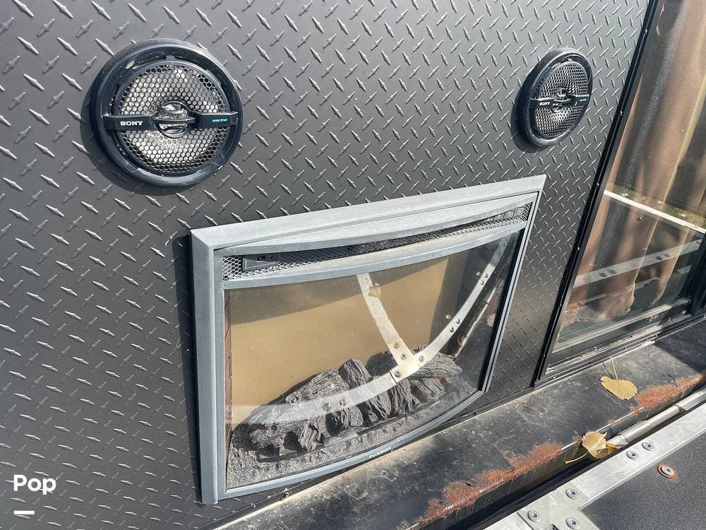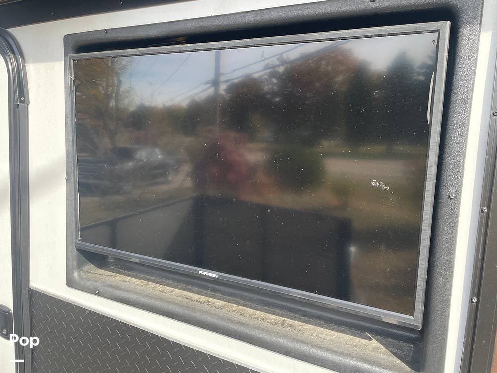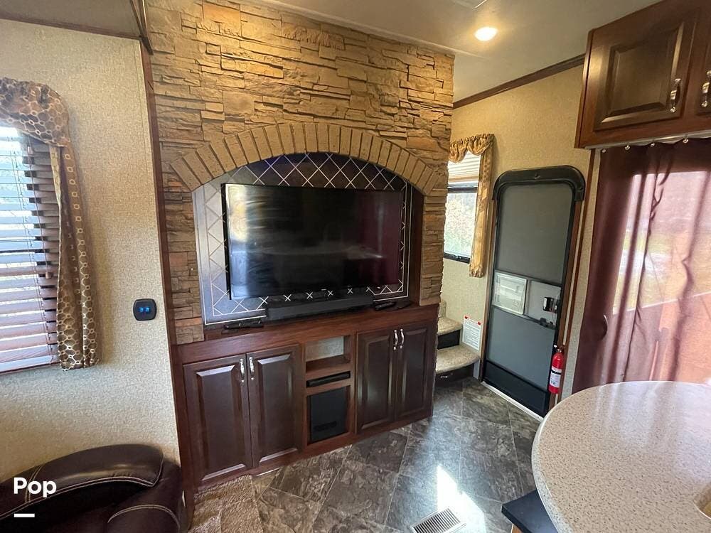 On the outside, you'll see that this trailer has an elevated side patio that is convenient for the 1/2 bath and has an outdoor fireplace and TV with a sliding glass door to the kitchen.