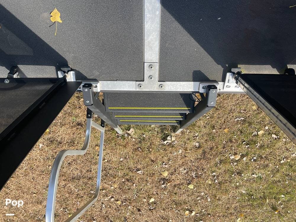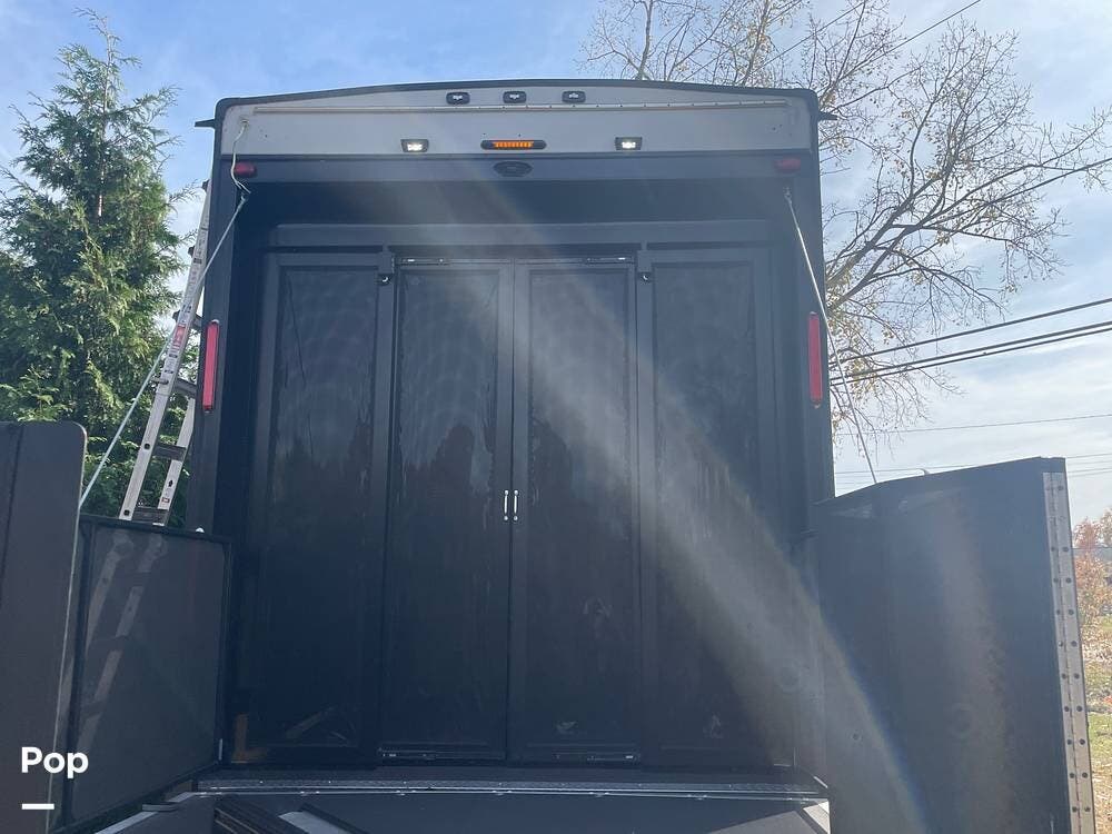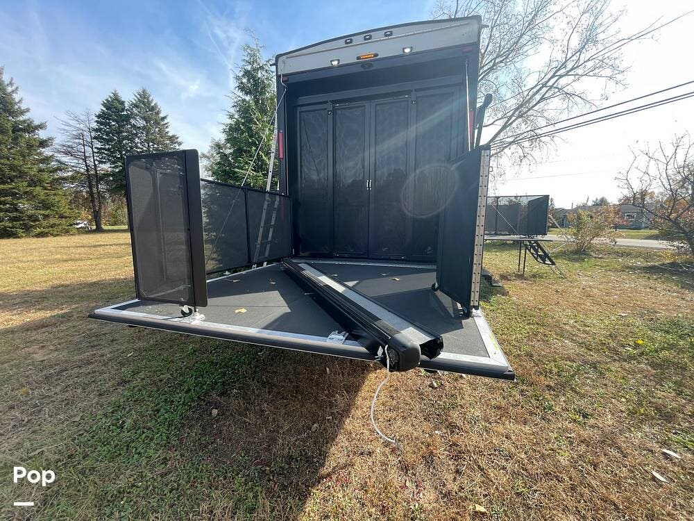 The rear ramp to the 12X8 ft garage doubles as a party deck with railings on all sides. The Garage has a drop-down bunk and bottom sofas that are removable so you can tie down your toys. There is a fueling station and an entertainment center with overhead cabinets.