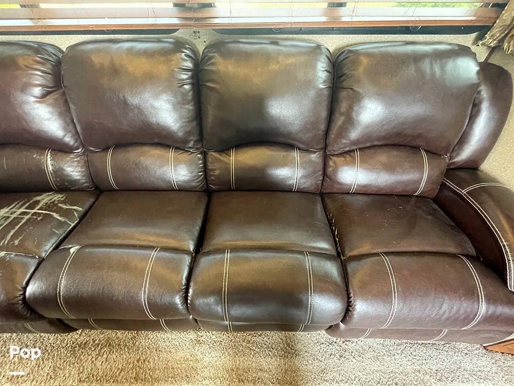 Across from the kitchen is a leatherette pullout couch in perfect viewing distance from the TV.