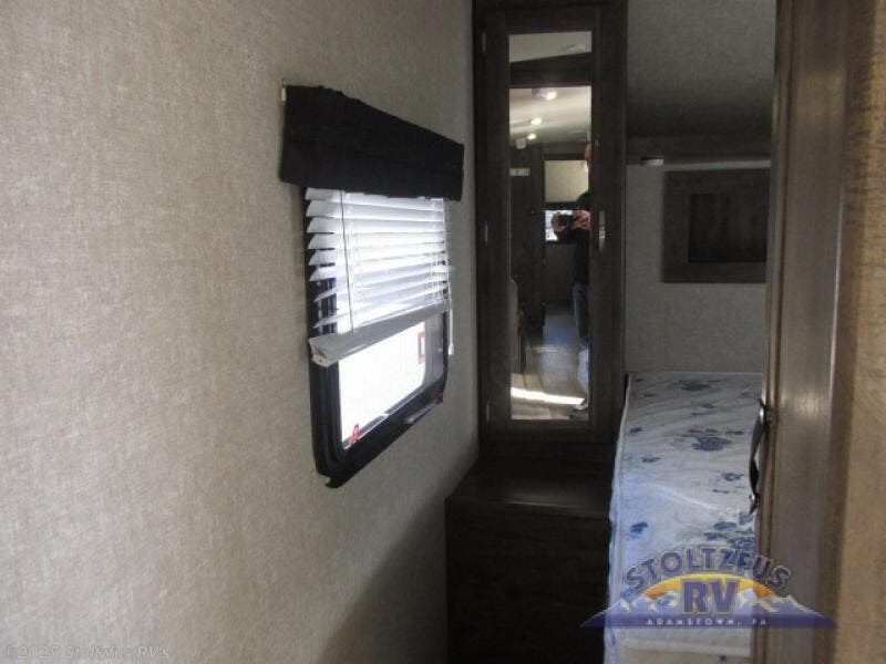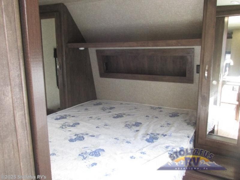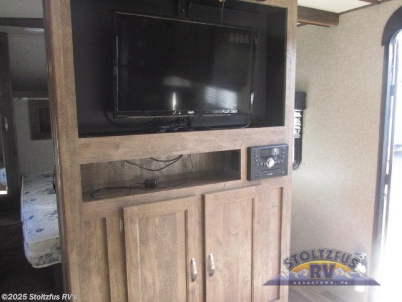 Toward the front of the trailer, just before you enter into the bedroom you will find an entertainment center. Inside the front bedroom there is a queen bed, wardrobes, and a shelf.