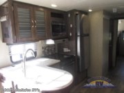 Stepping inside the travel trailer, to the left there is a double kitchen sink, three burner range, microwave, and refrigerator. Along the opposite side of the kitchen you will find a slide with a sofa and a u-dinette. Next to the slide there is a large wardrobe.