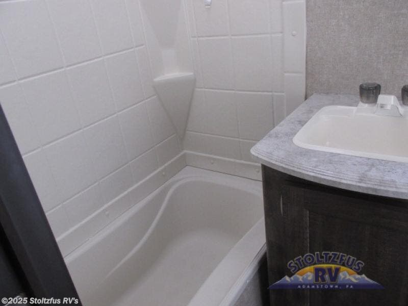 The bathroom is located toward the rear of the travel trailer. Inside the bathroom you will find a toilet, sink, medicine cabinet, and tub. There is also a private entrance from the bathroom leading outside.