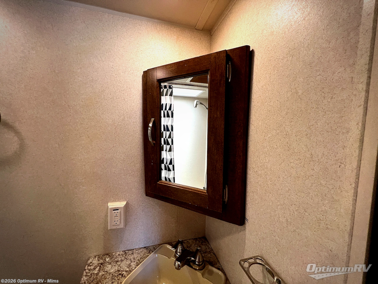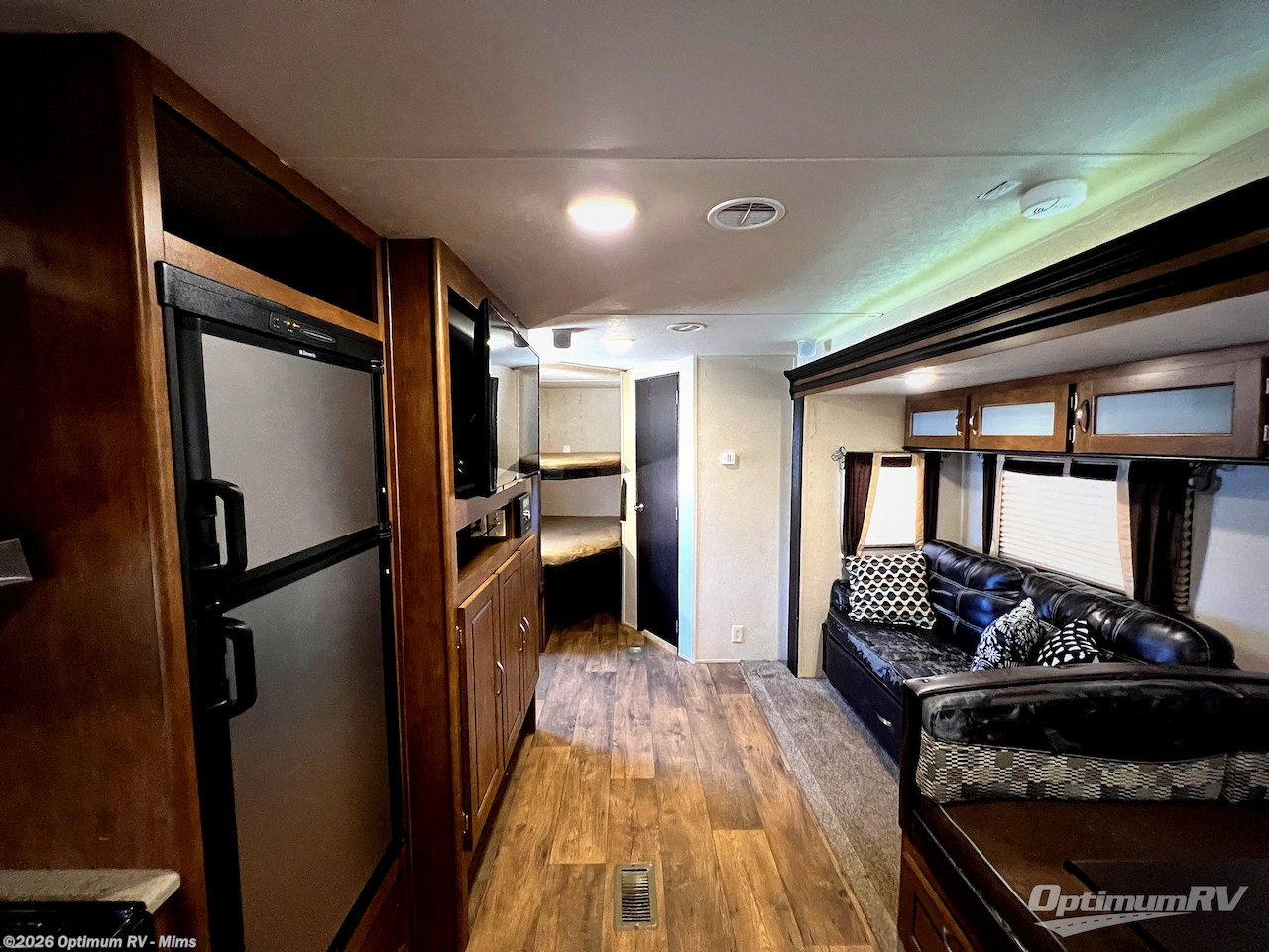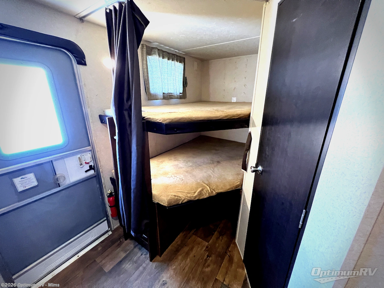 Enter inside this model, and along the rear left corner there is a set of bunk beds with a ladder which allows for easy access to the top bunk. The opposite corner of the trailer features a bathroom with a sink & medicine cabinet, shower/tub, and a toilet.