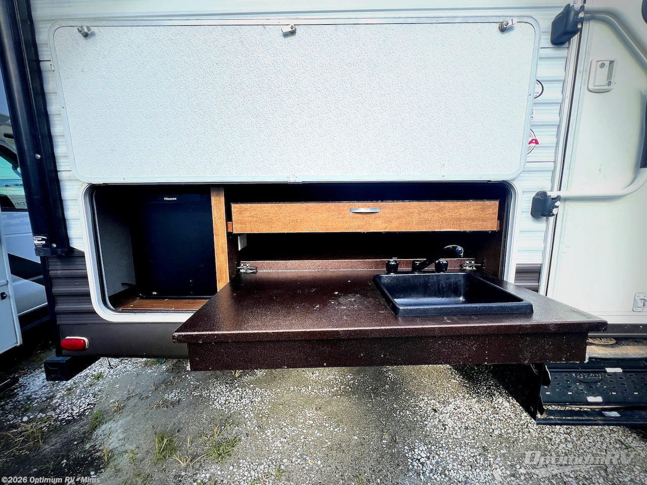 Outside enjoy the pass through storage space for all of your extra camping gear. The 16' awning provides plenty of shade from the sun, and you can easily fix snacks at the outside camp kitchen, near the camp kitchen there is a baggage door which adds additional storage, plus much more!