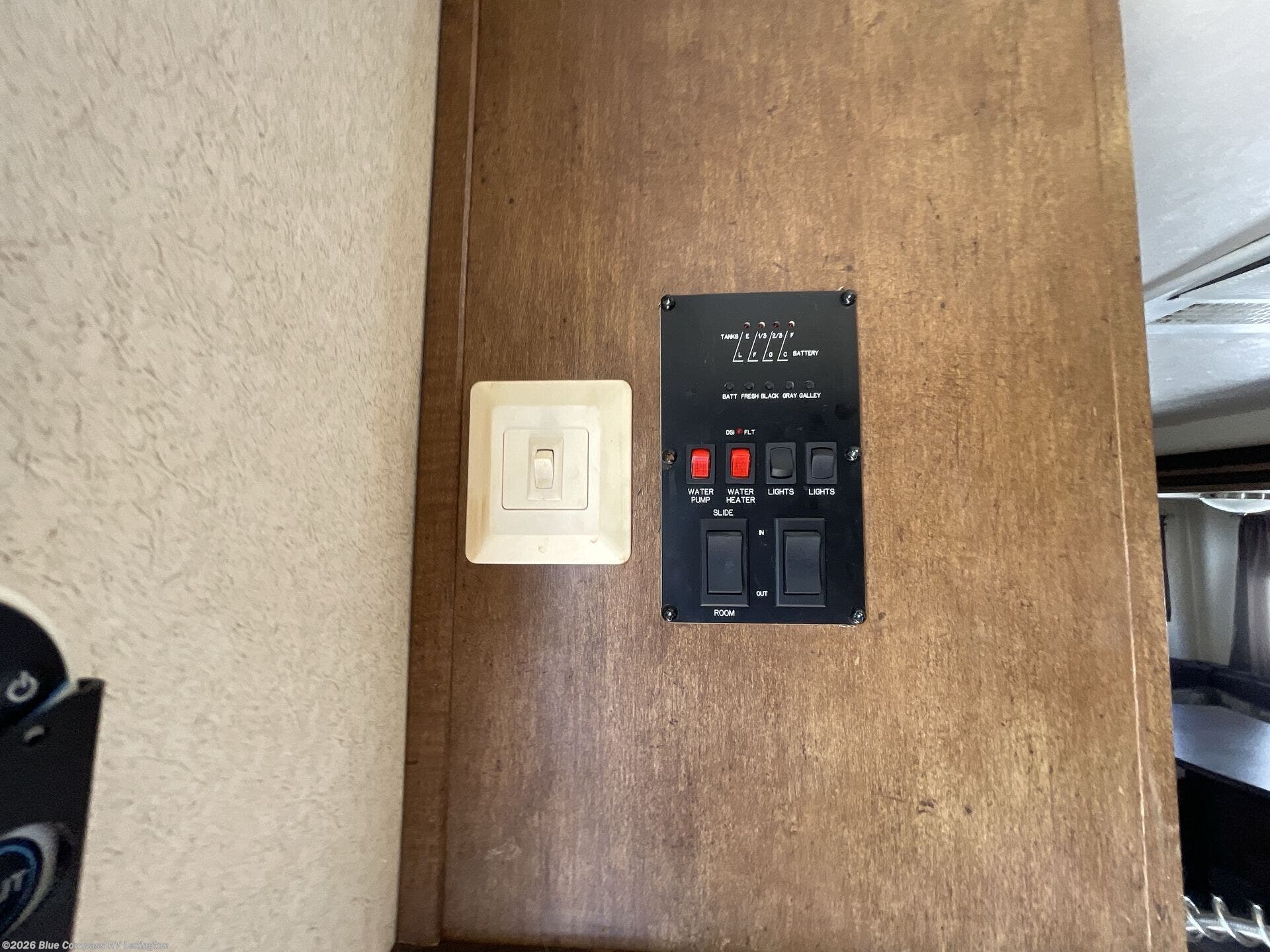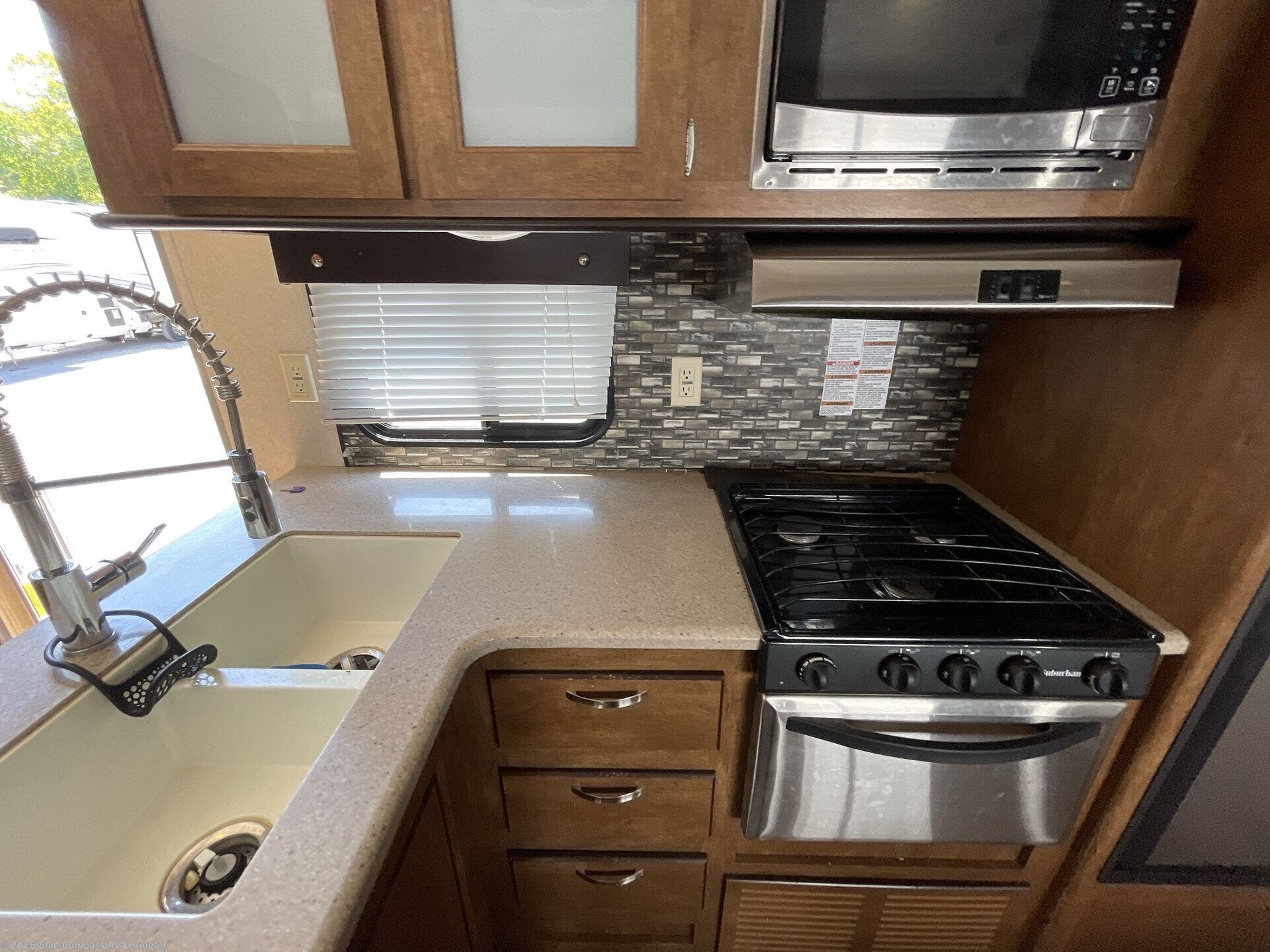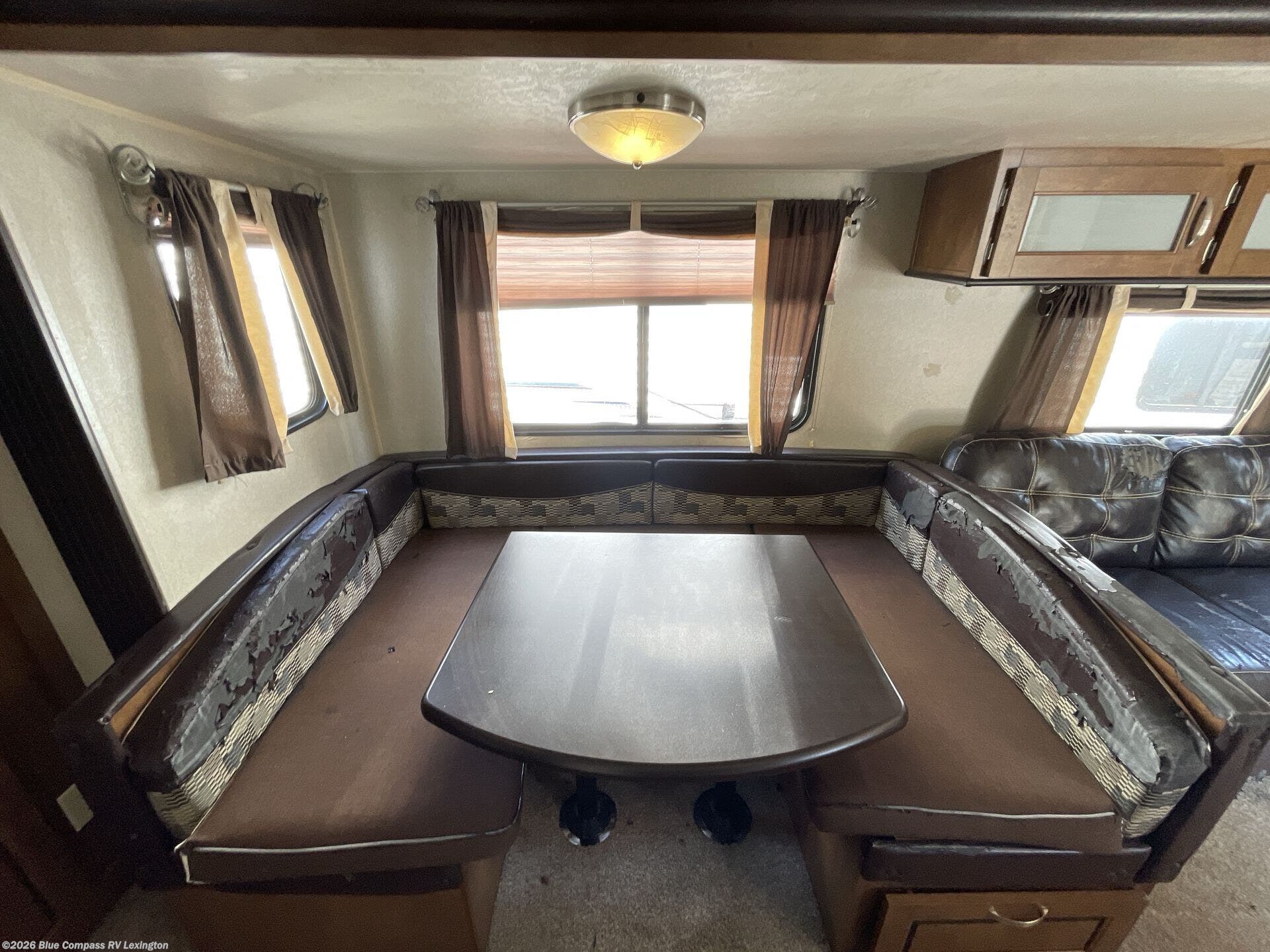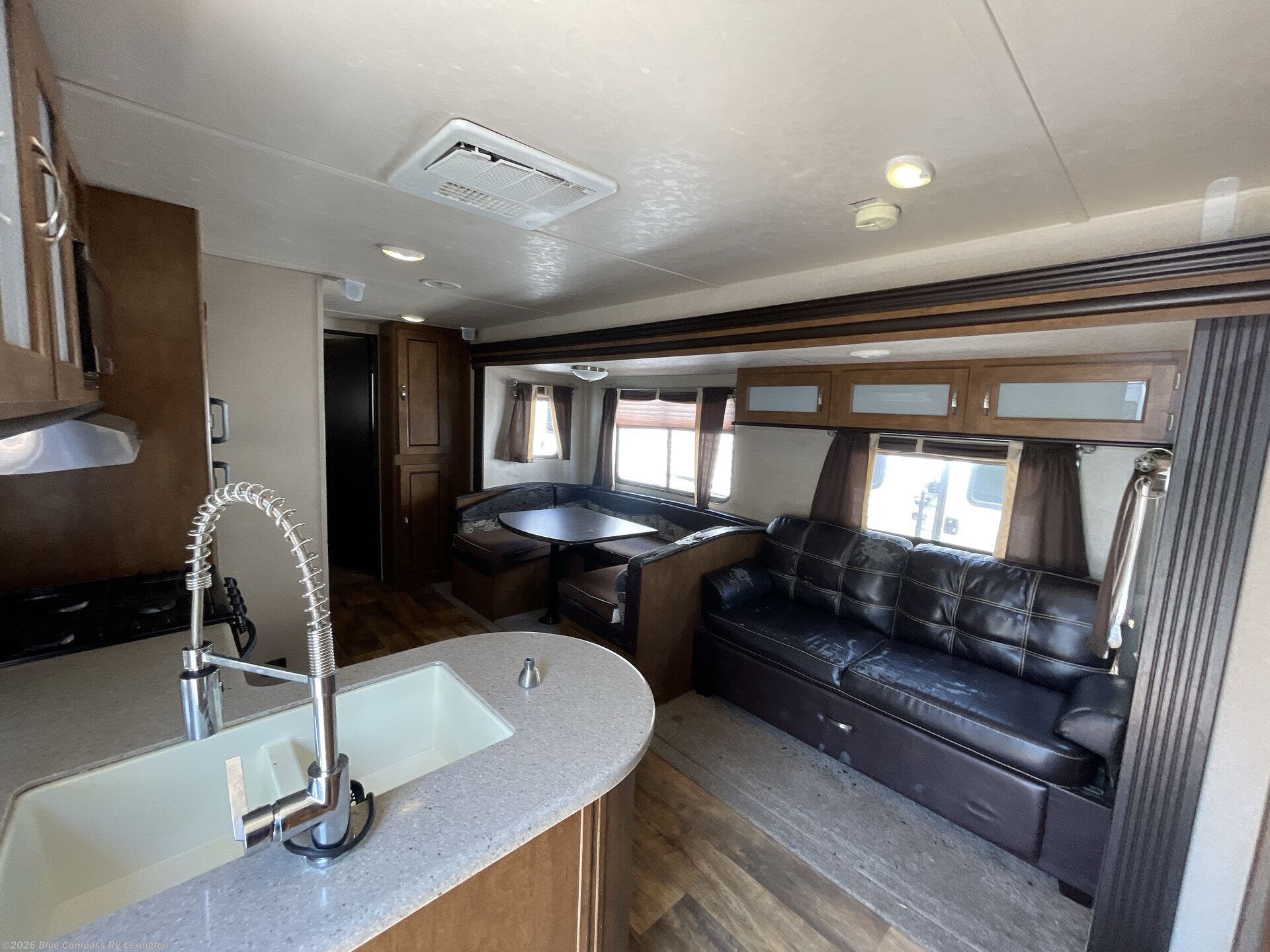 As you enter the travel trailer, to the left there is a double kitchen sink, three burner range, microwave, and refrigerator. Along the opposite side of the trailer you will find a slide out with a sofa and u-dinette. Next to the dinette there is a nice size pantry. Along the front of the living area you will find a swivel box for your convenience.