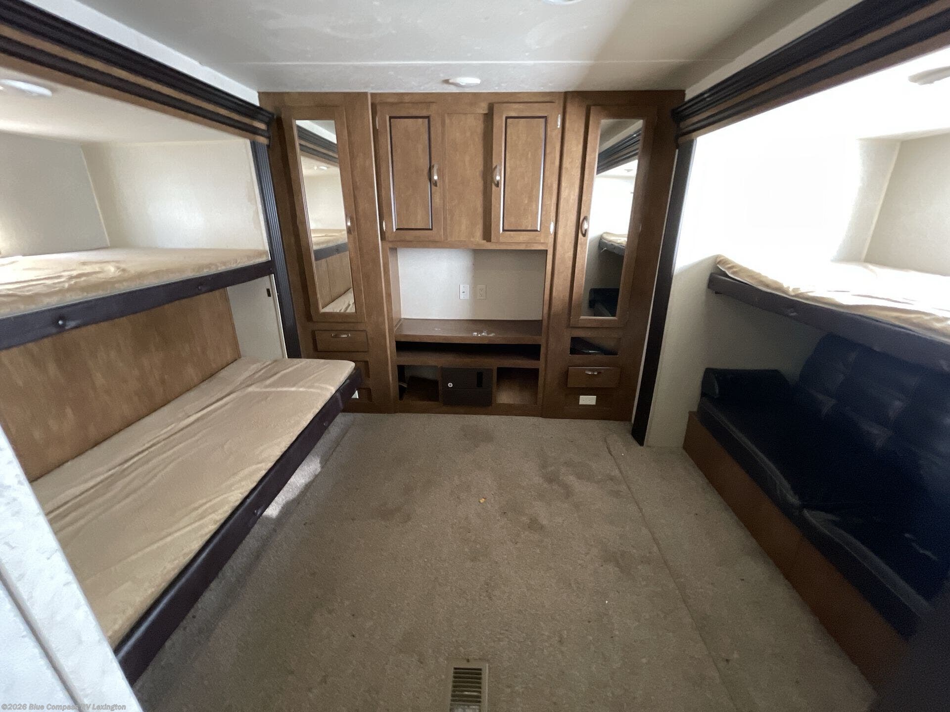 In the rear of the travel trailer you will find the bunk house. There are two slide outs and each slide has a set of bunk beds. Along the rear wall you will find two wardrobes and an entertainment center.