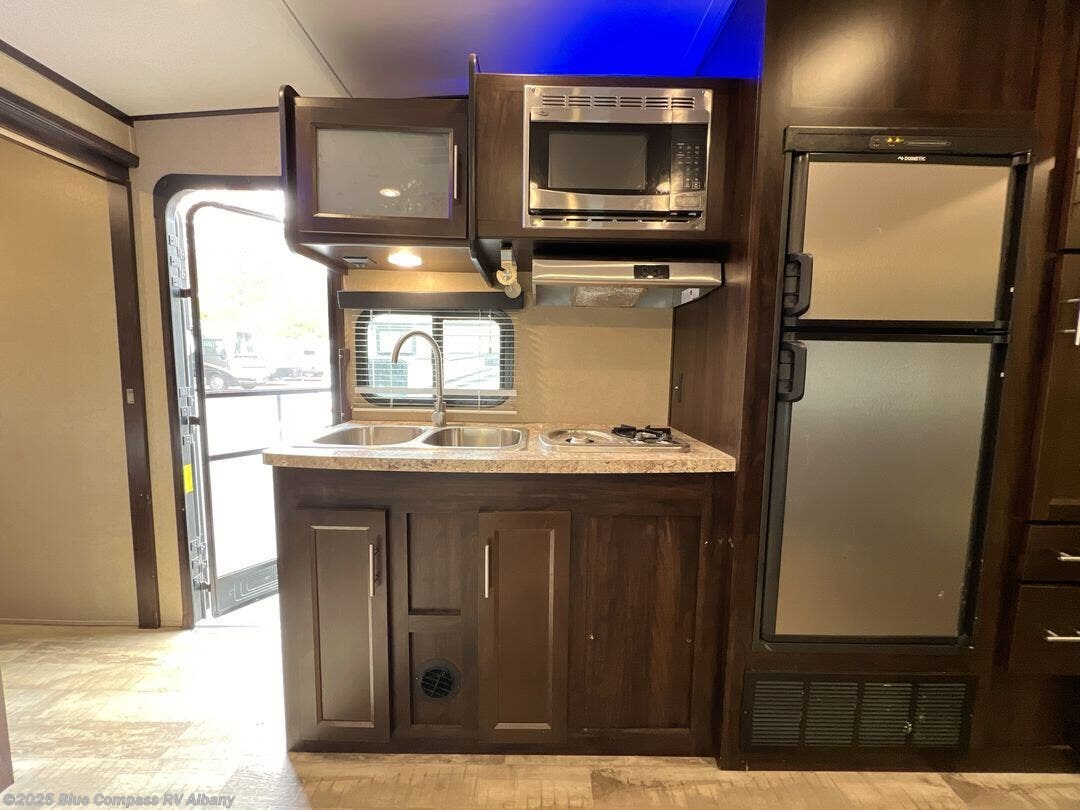 As you enter to the left you will find along the curb side wall a double kitchen sink, a two burner cook-top, refrigerator, and pantry. The opposite side features a slide out with a u-dinette, or in place of the dinette you can choose an optional three recliner sofa. Adjacent to the slide out there is a monster pantry which is ideal for storing all of your dry and canned goods. Along the front of the living area you will find an entertainment center.