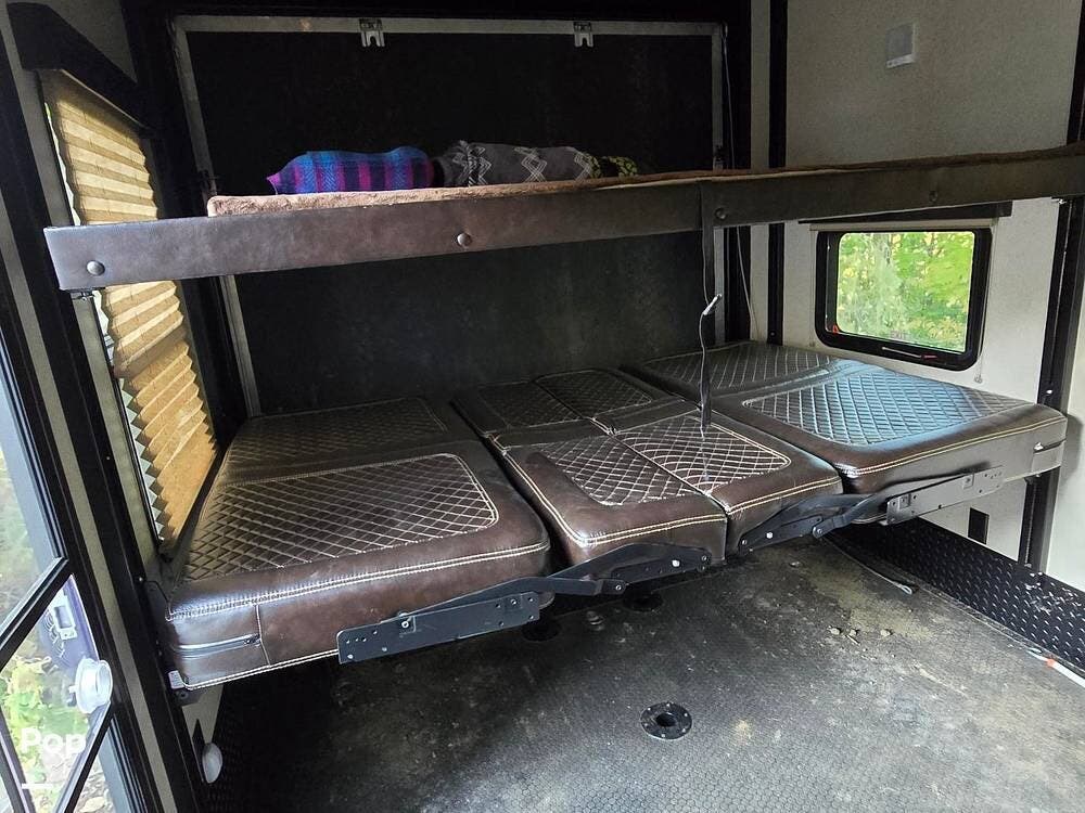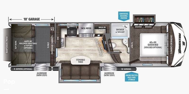 This toy hauler features a 10' garage with the convertible dinette and the top bunk. It also features a ramp patio with an overhead awning. There's a 60-gallon fueling station on board as well as a 5.5kW generator!