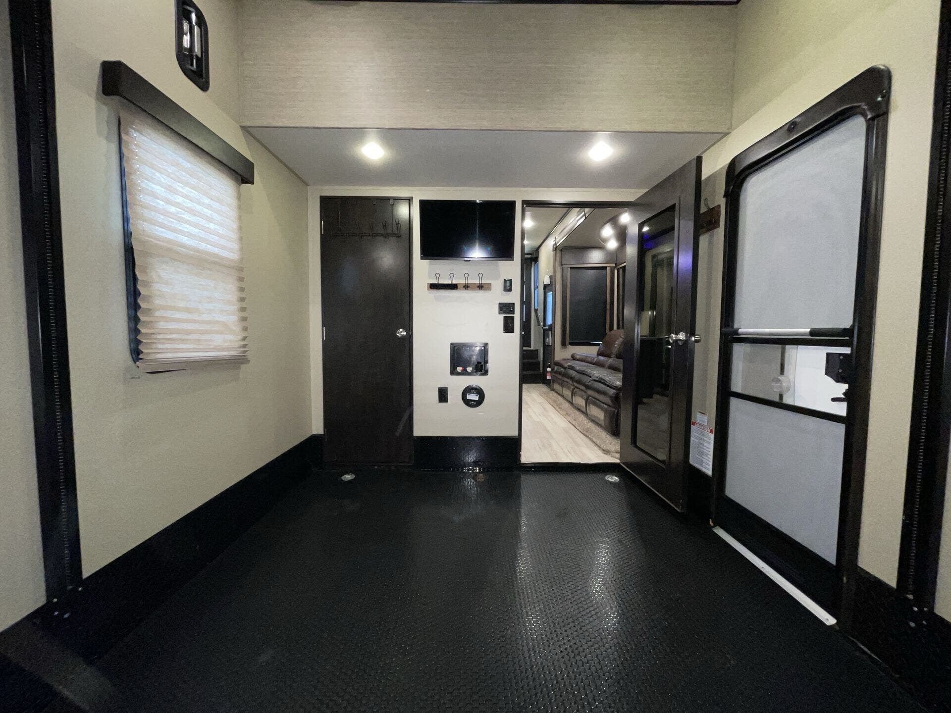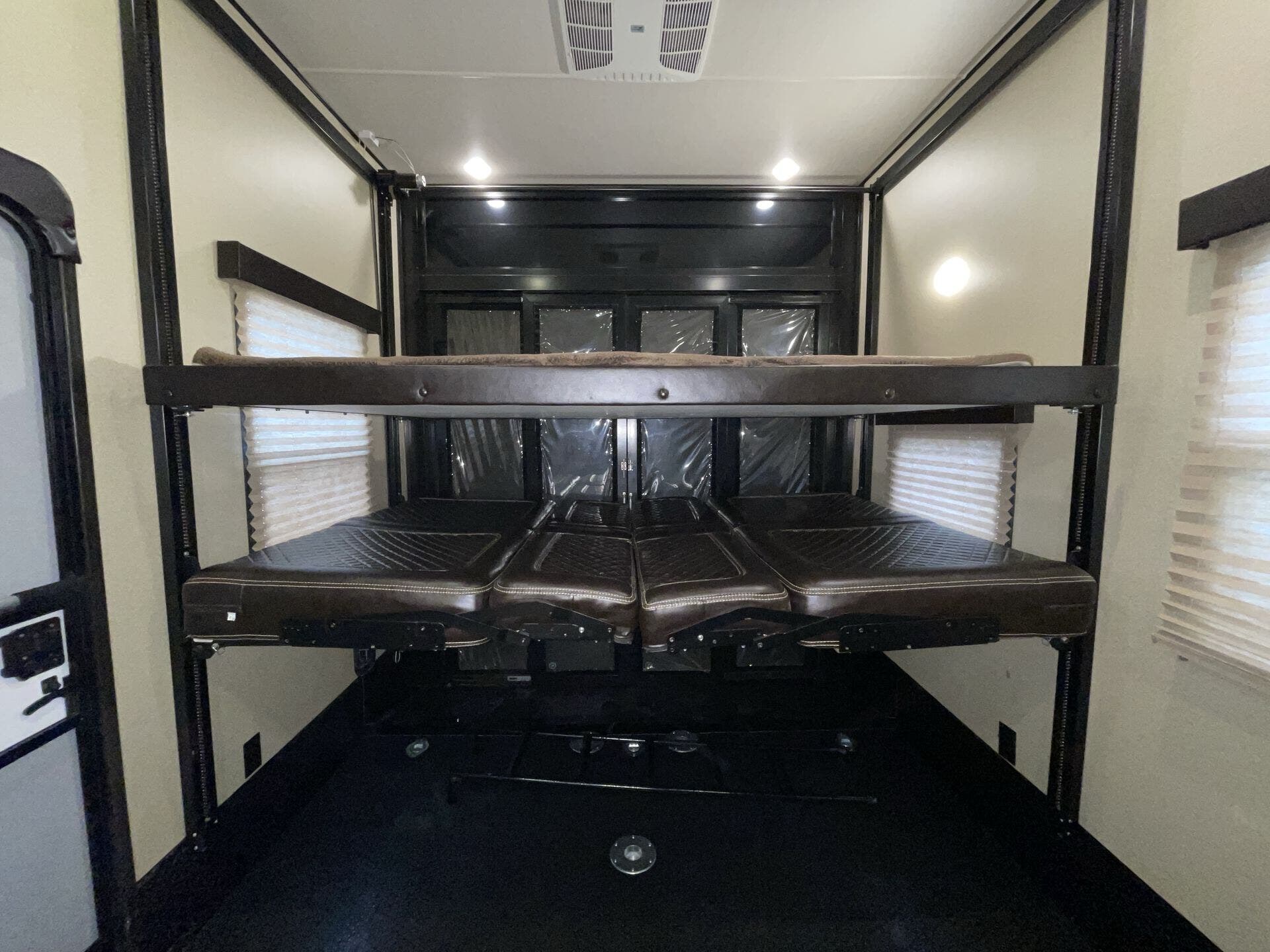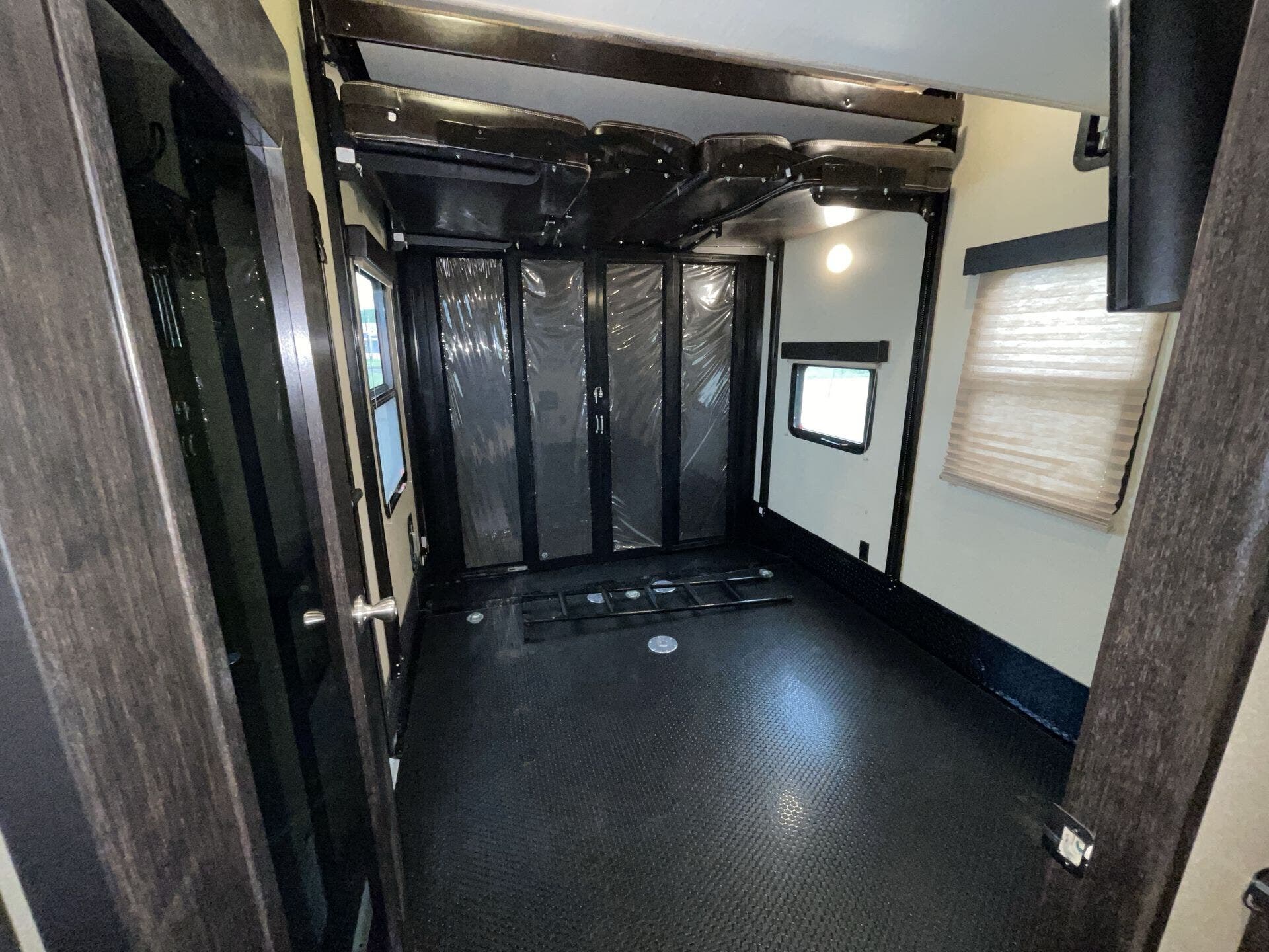 The 11-foot garage is a standout feature, giving you the flexibility to haul motorcycles, ATVs, or gear while doubling as additional living or sleeping space with the Happi-Jac bed system and convertible seating. The rear ramp door also transforms into a patio, creating a versatile outdoor living area.