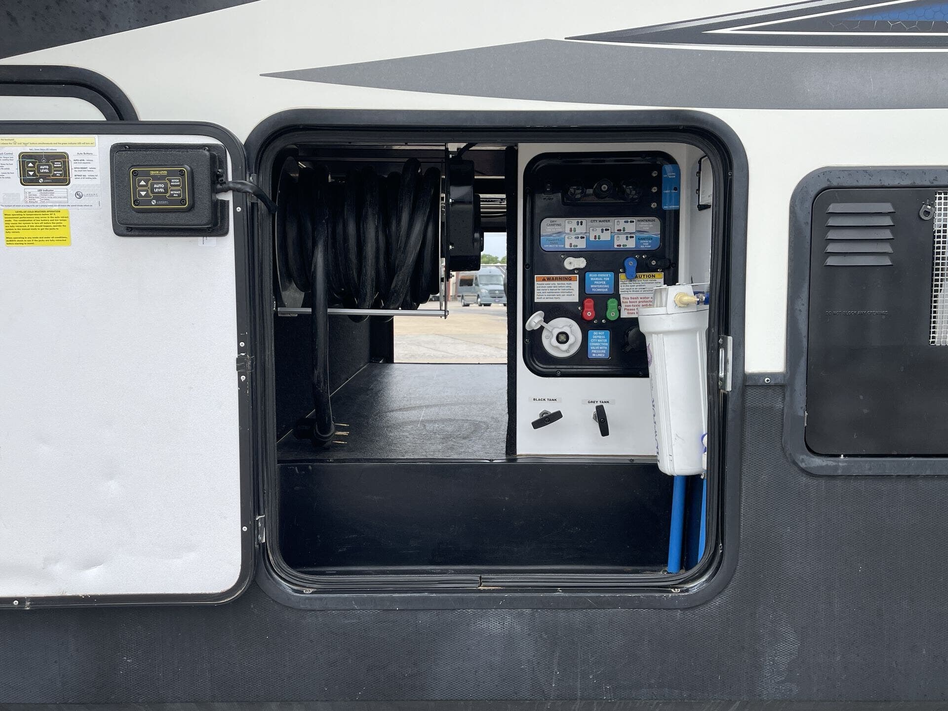 Awning, Black Tank Flush, Exterior Stereo, Heated Underbelly, Ladder, Leveling Jacks, Outside Entertainment Center, Pass Thru Storage, Power Awning, Roof Vent, Screen Door, Slam Latch Baggage Doors, Slideout, Spare Tire Kit -