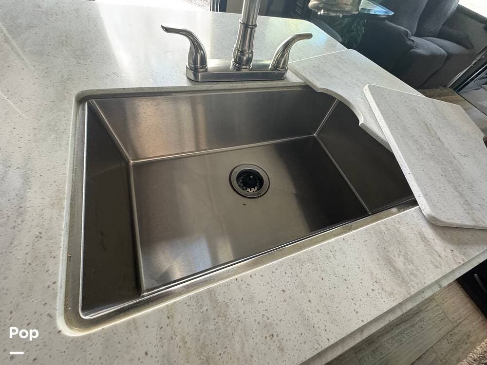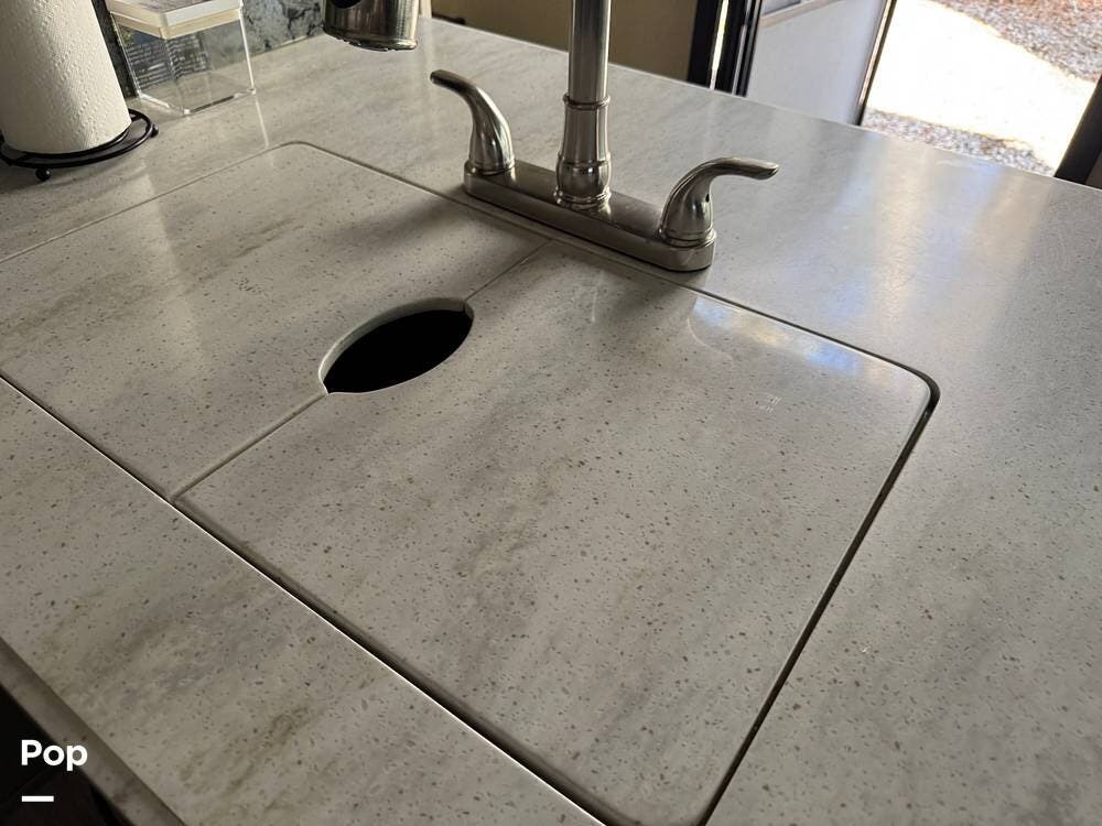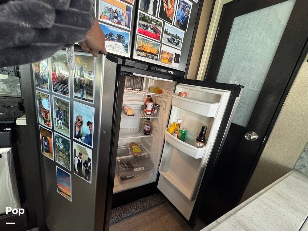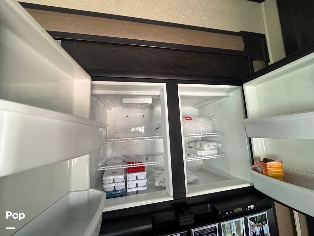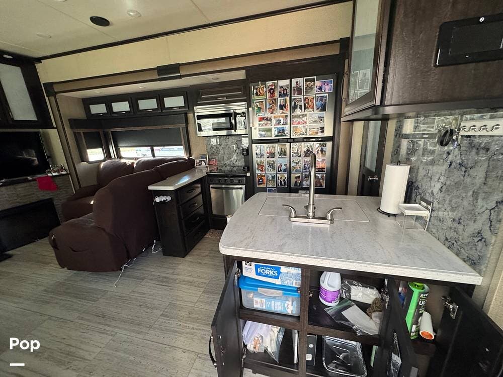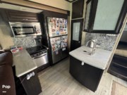 If you were looking for a toy hauler, you should definitely consider this one! When you walk in, you'll find a nice-sized kitchen with plenty of counter space and a residential refrigerator and freezer.