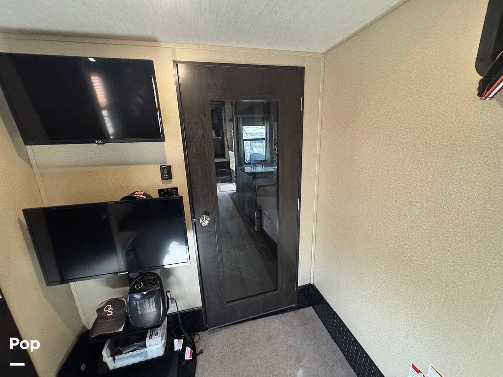 The toy hauler section features beds that raise and lower, and a half bath. Here you will also find the washer and dryer prep.