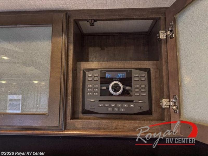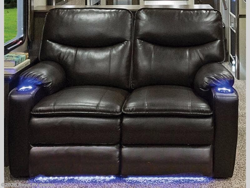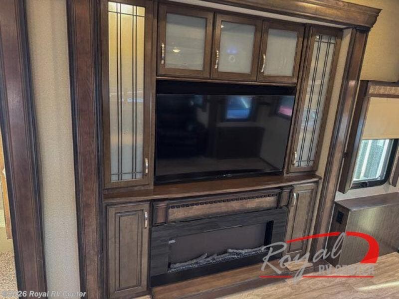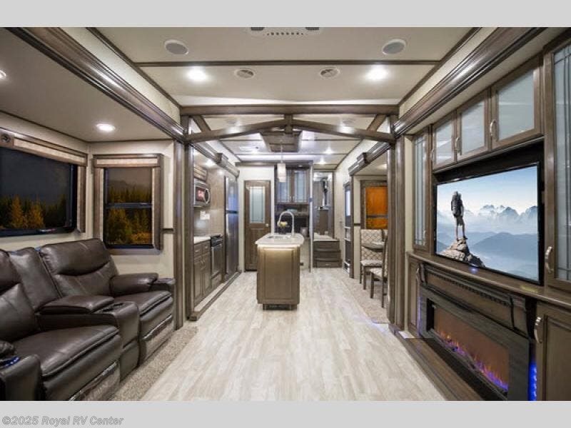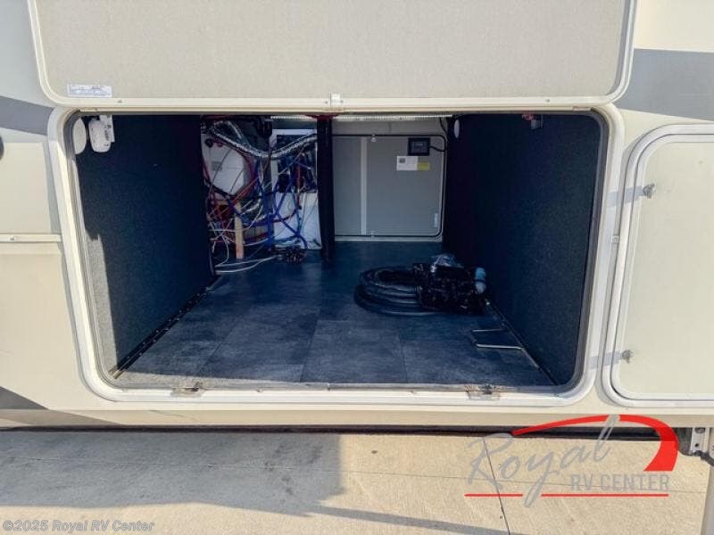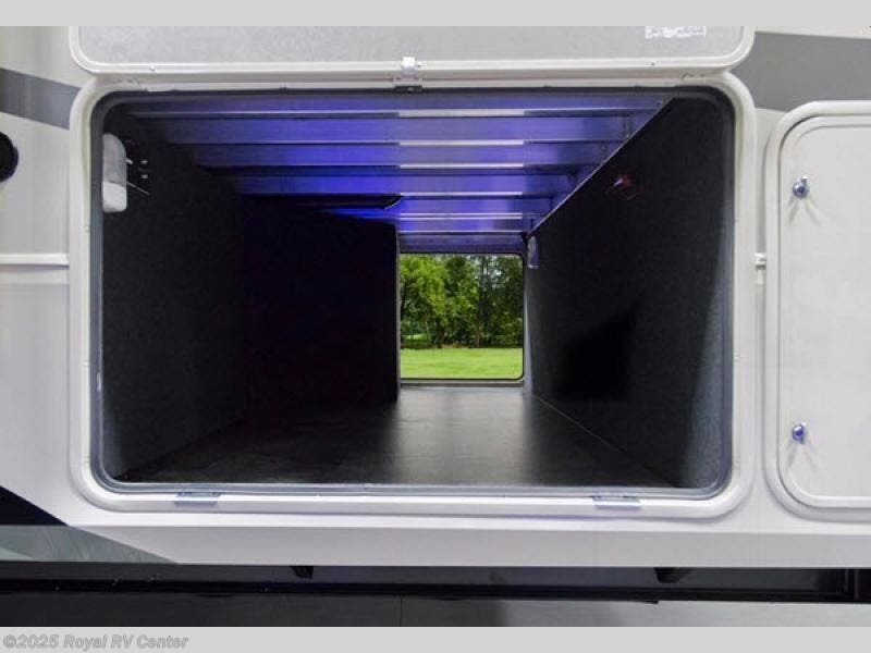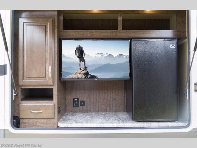 Outside enjoy an exterior LED TV and refrigerator to keep cold drinks handy. You will also love the unobstructed pass-through storage compartment for all of your outdoor camping items, plus universal docking station, and so much more!