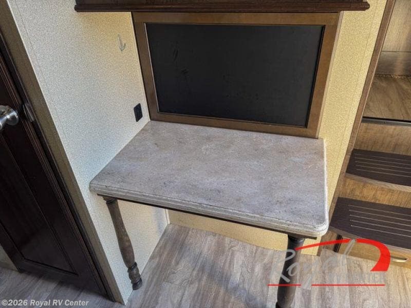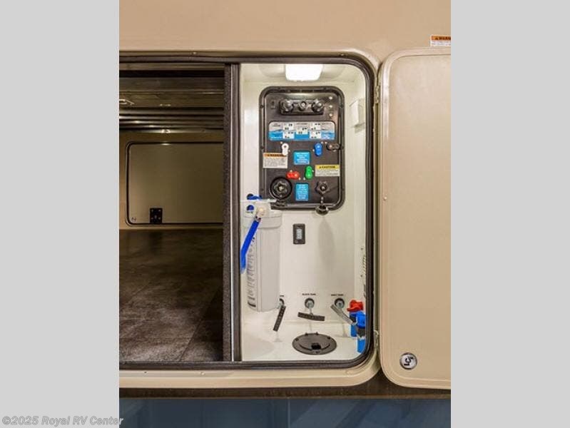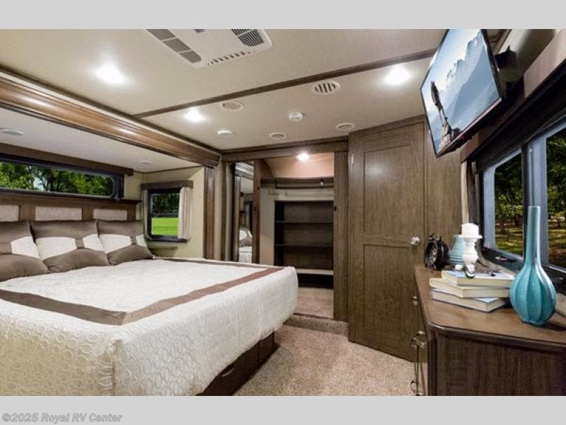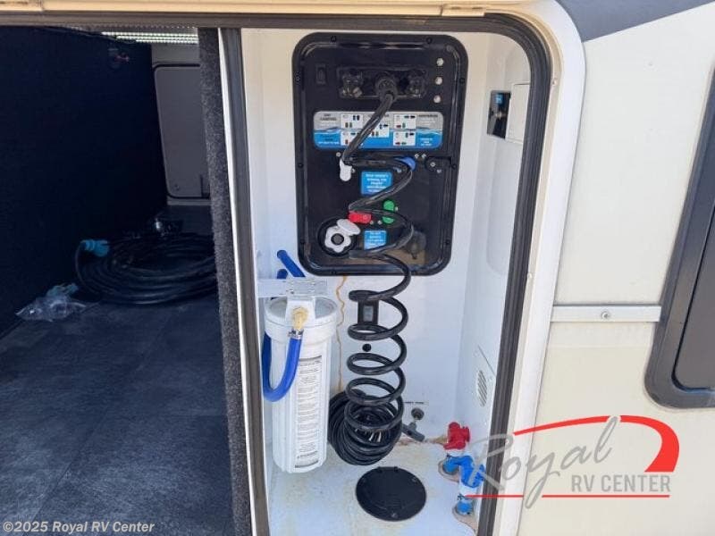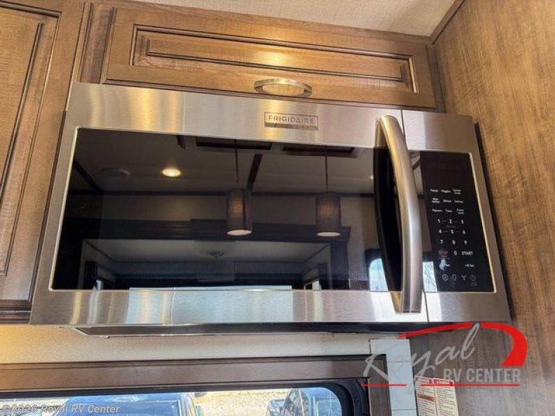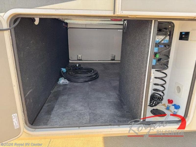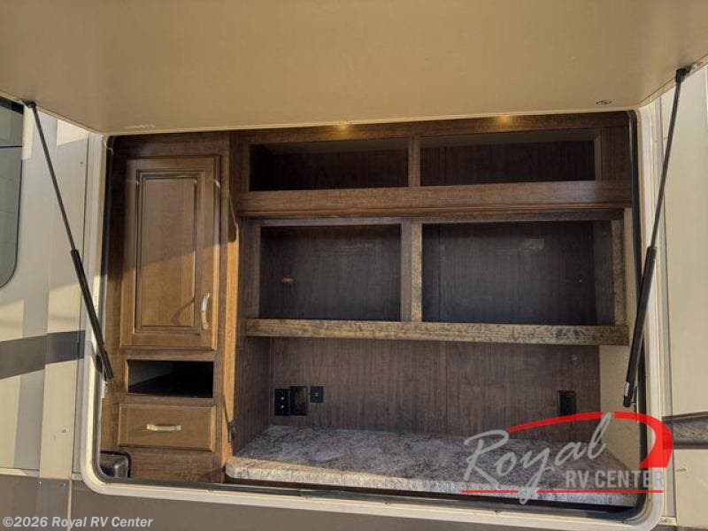 Outside enjoy an exterior LED TV and refrigerator to keep cold drinks handy. You will also love the unobstructed pass-through storage compartment for all of your outdoor camping items, plus universal docking station, and so much more!