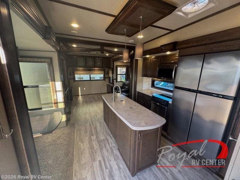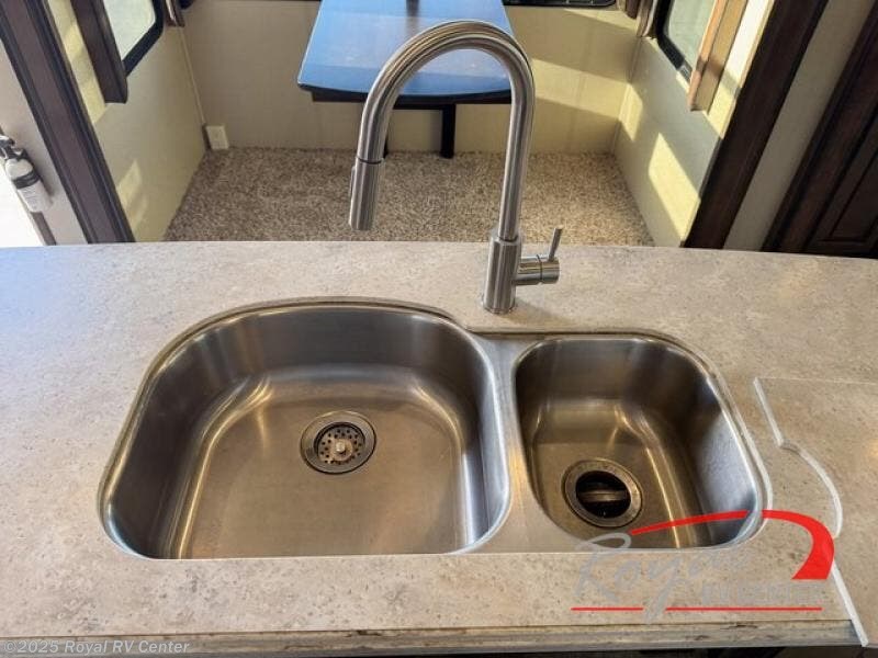 Step inside and notice how open and spacious the kitchen is. There are dual opposing slides in this area alone with the first slide to the left of the entry door featuring a free standing dinette. Opposite you will find a slide out 18 cu. ft. refrigerator, a three burner range with overhead microwave oven, and overhead cabinetry with a bit of counter space. You will love the center island which features a double sink, plenty of prep space, and it has also been prepped for a dishwasher. Add this option and spend more time outdoors rather than doing the dishes after each meal! To finish out the kitchen, along the interior wall, you will find a pantry, plus more counter and storage space for your dry goods and daily dishes.
