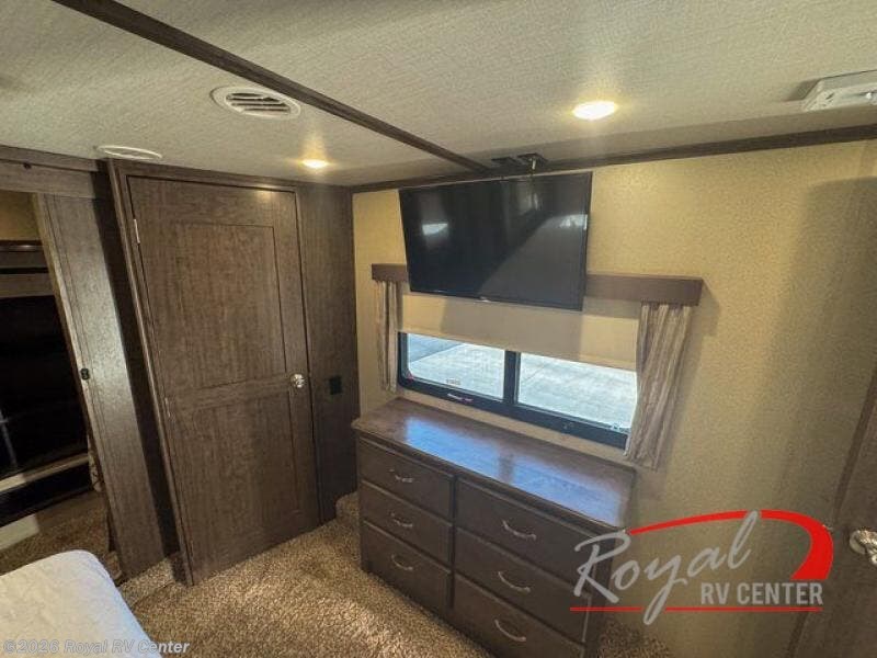 Just outside the bathroom there is a door to the front private bedroom. Here you will enjoy plenty of room thanks to a slide out queen bed including a pull-out ottoman. There is a full front wardrobe for your hanging clothes, shirt storage, a dresser, and a closet that has been prepped for a washer and dryer. No pile of dirty laundry to take home here when you choose this option.