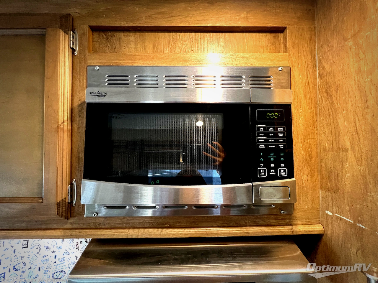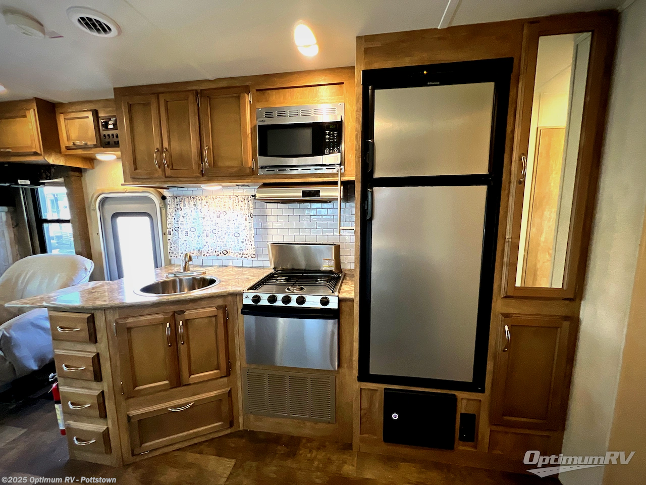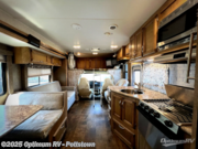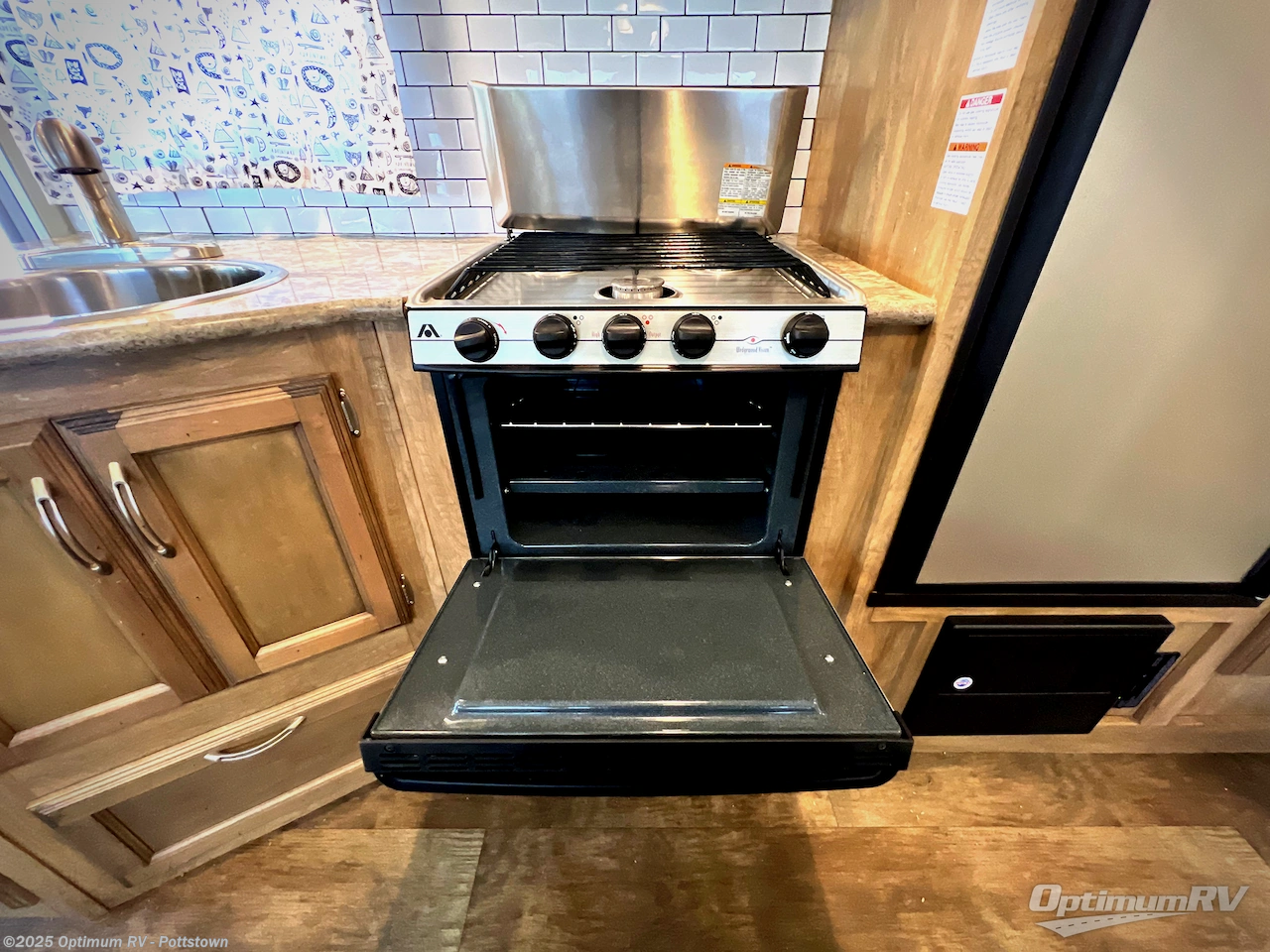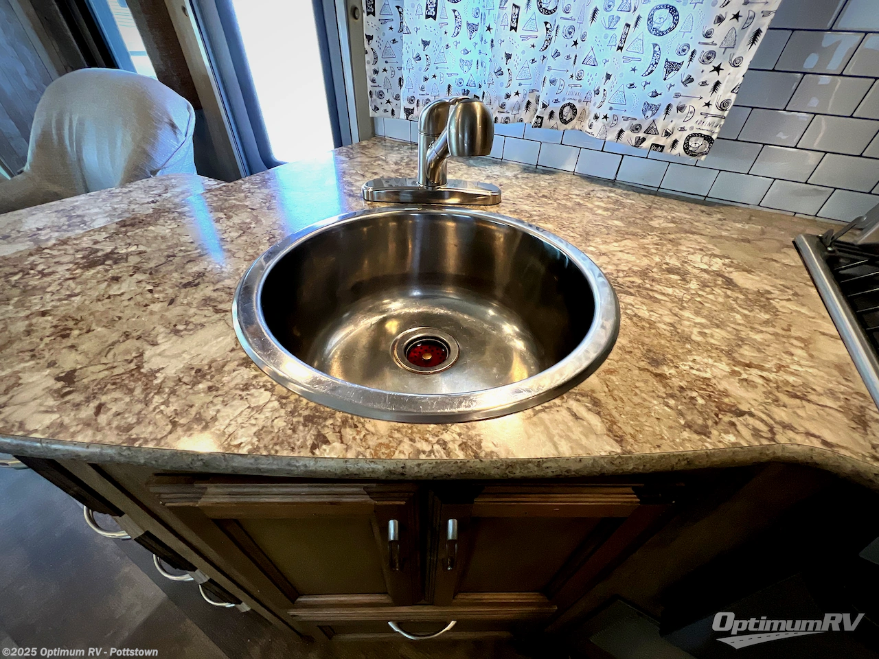 As you enter to your right there is a lounge chair with overhead storage, a bunk above the cab with optional storage, and an optional TV with a swing arm. Straight inside the door there is a jackknife sofa and booth dinette slide allowing more floor space in the living and kitchen combined area. Along the curb side is an angled countertop with a double kitchen sink, three burner range, microwave, refrigerator, and a pantry for your dry goods.